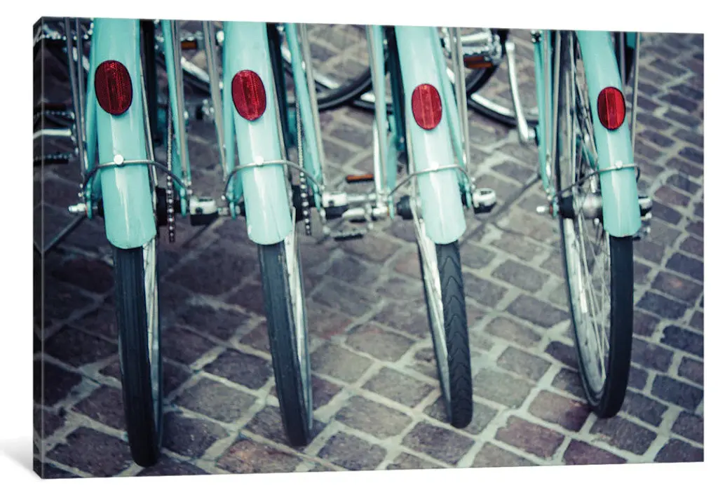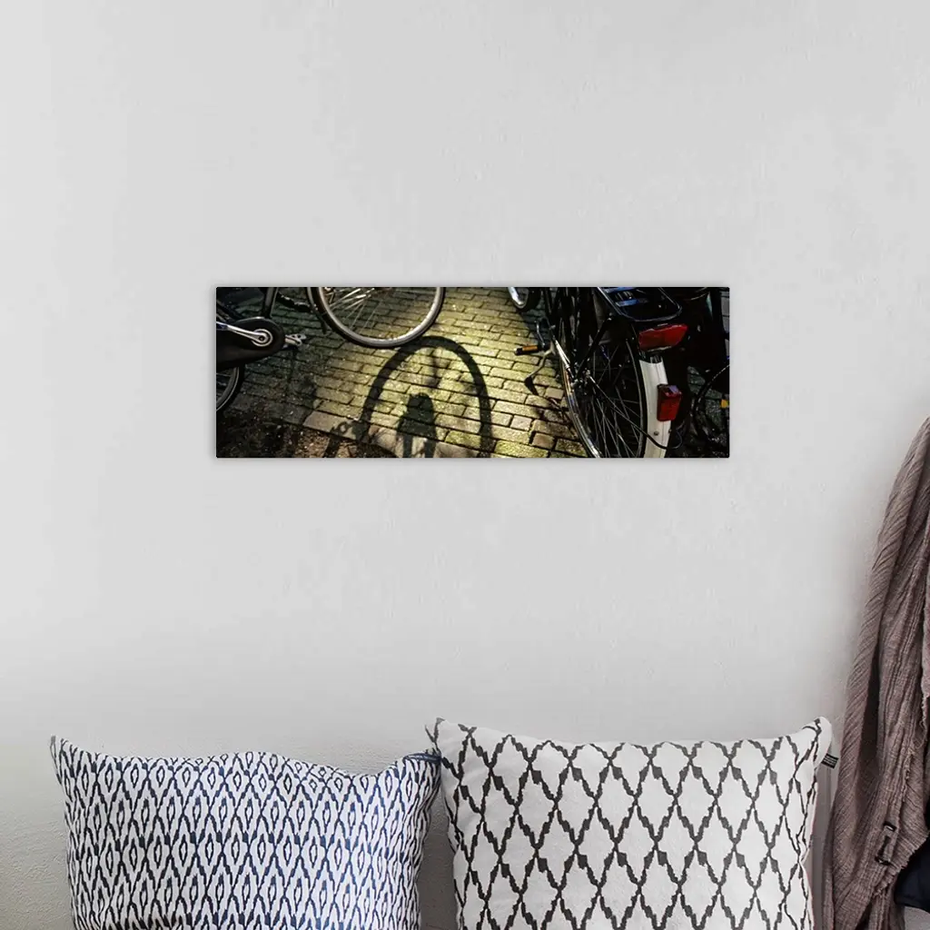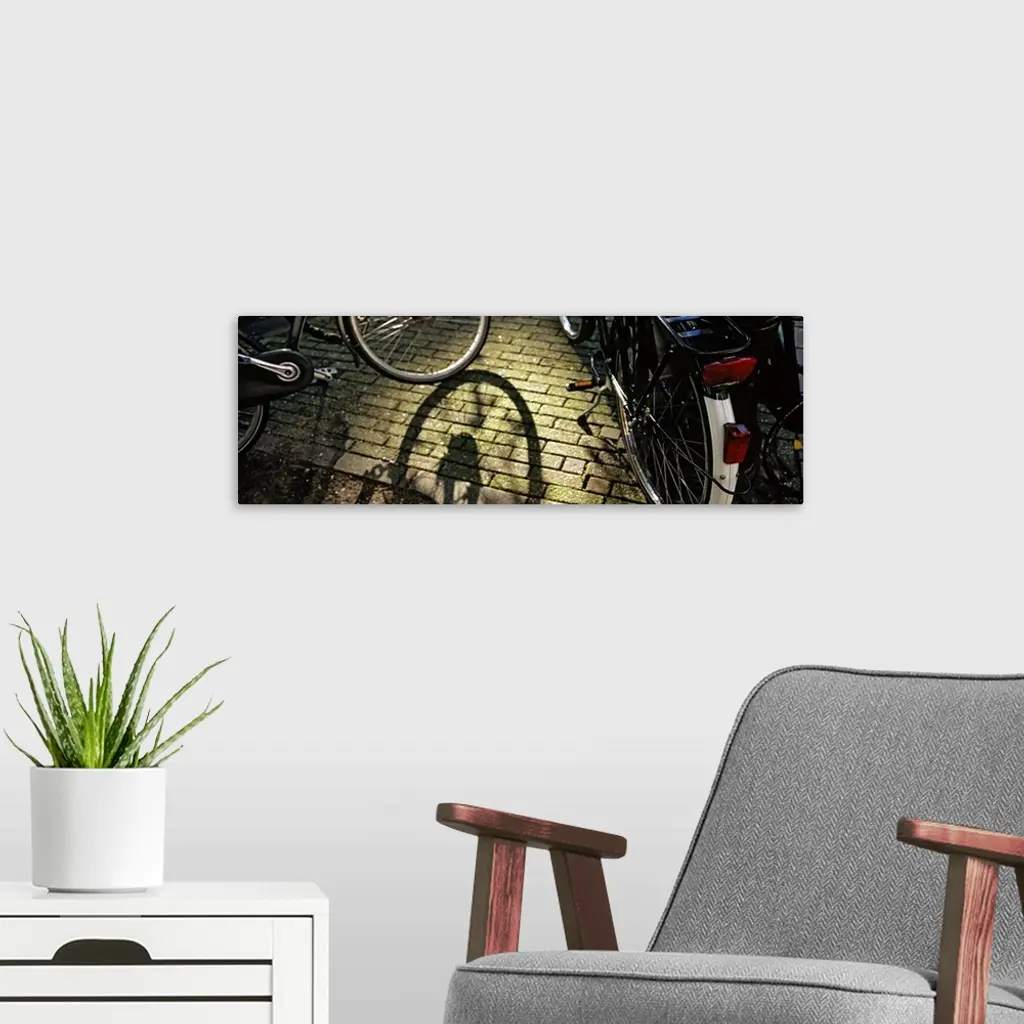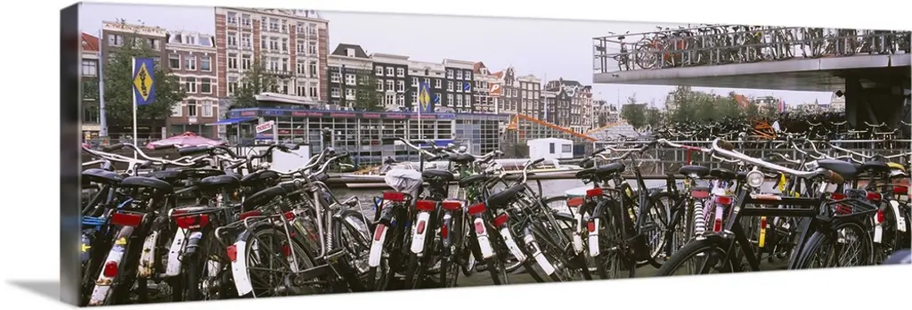 High angle view of bicycles parked on the sidewalk, Amsterdam, Netherlands wall art for home and office decor. Discover canvas art prints, photos, mural, big canvas art and framed wall art in GreatBigCanvas.com's varied collections.