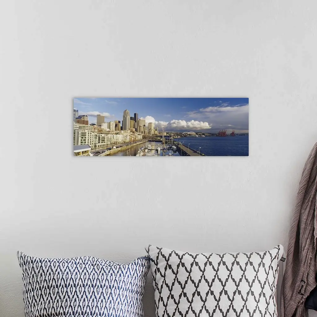 High angle view of boats docked at a harbor, Seattle, Washington State wall art for home and office decor. Discover canvas art prints, photos, mural, big canvas art and framed wall art in GreatBigCanvas.com's varied collections.