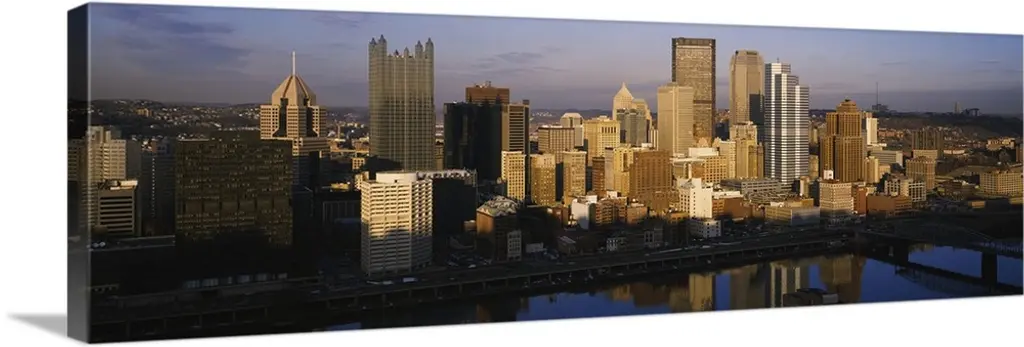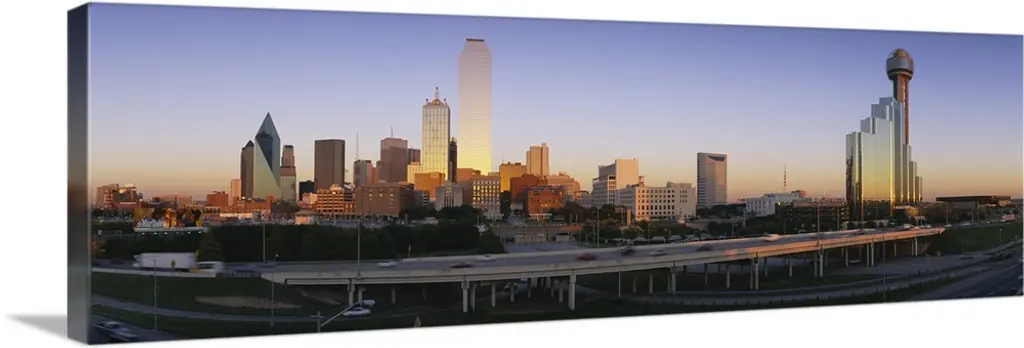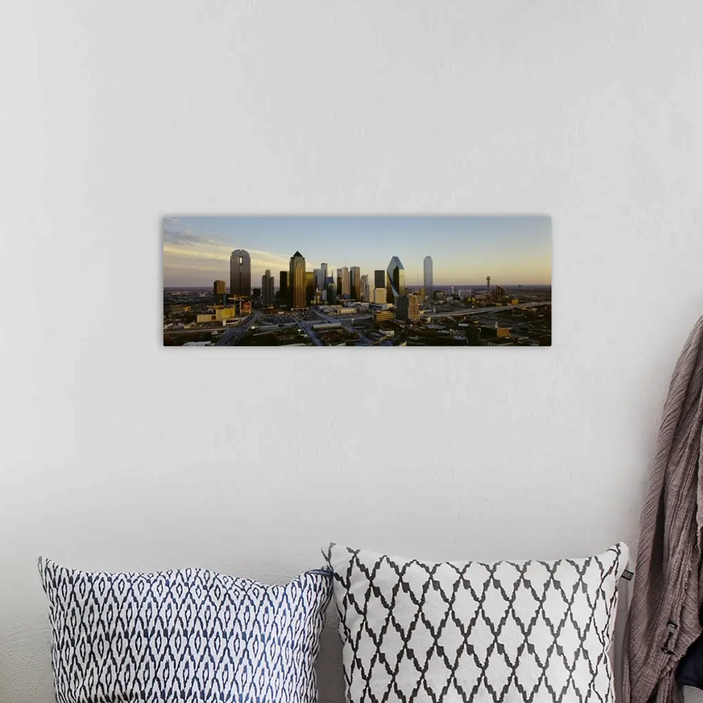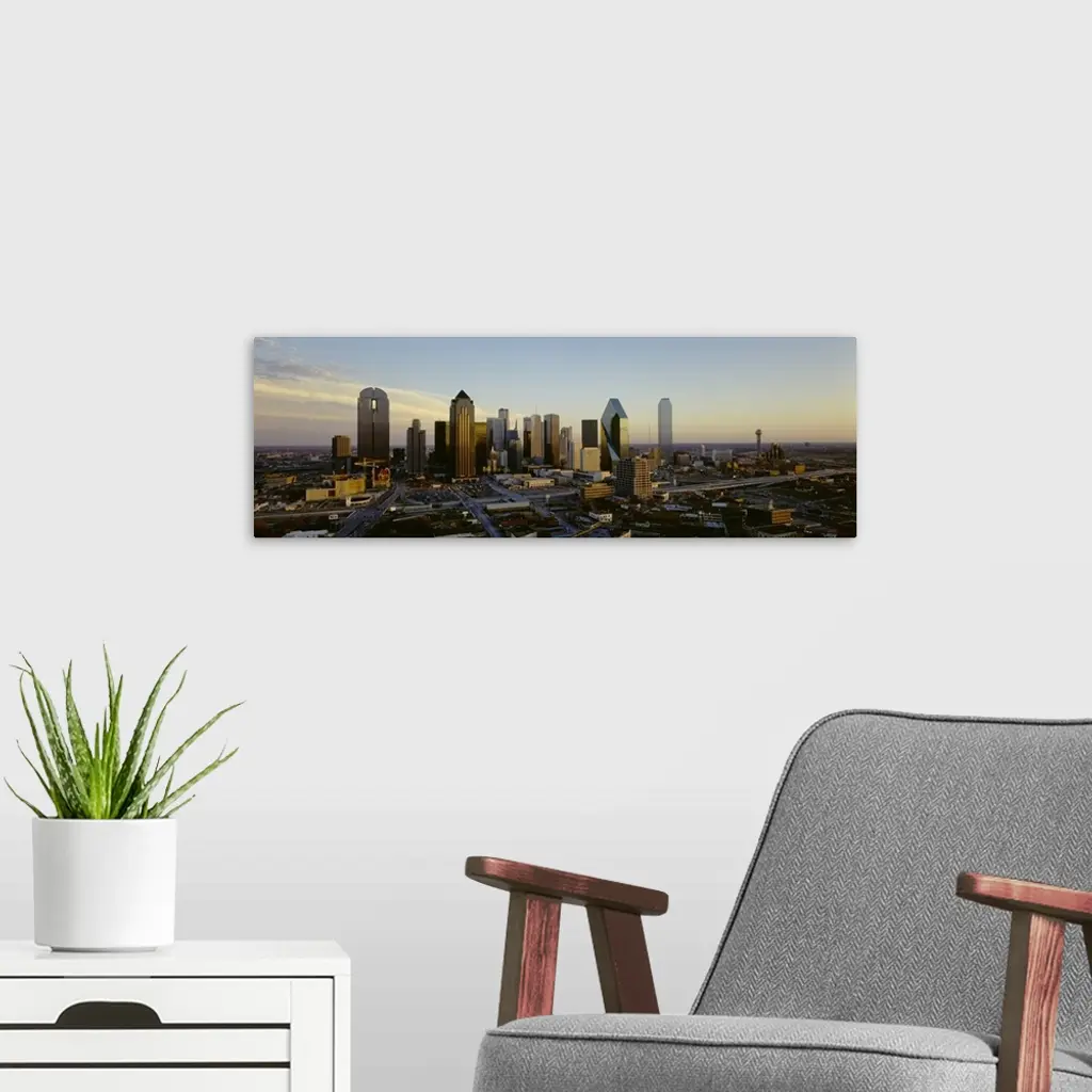 Buildings in the Dallas skyline are photographed in panoramic view during dawn.