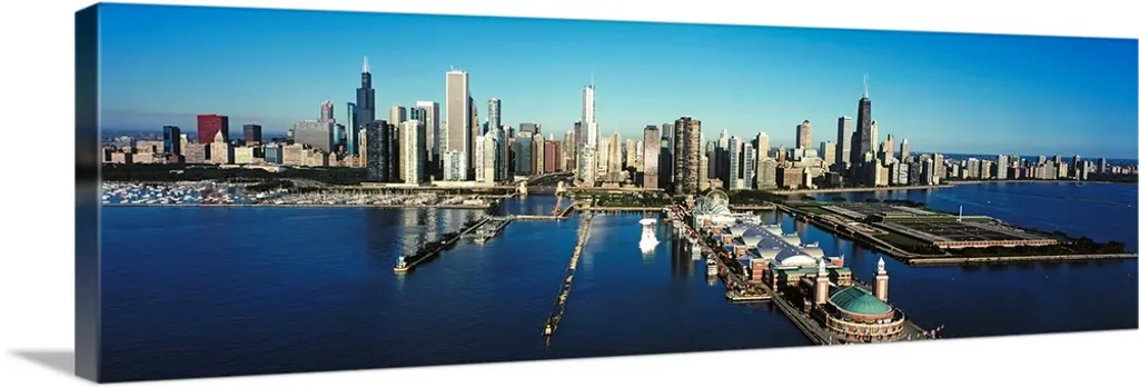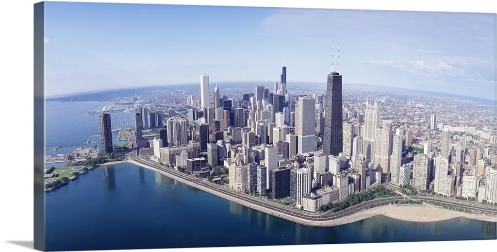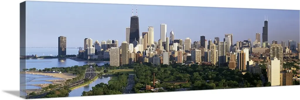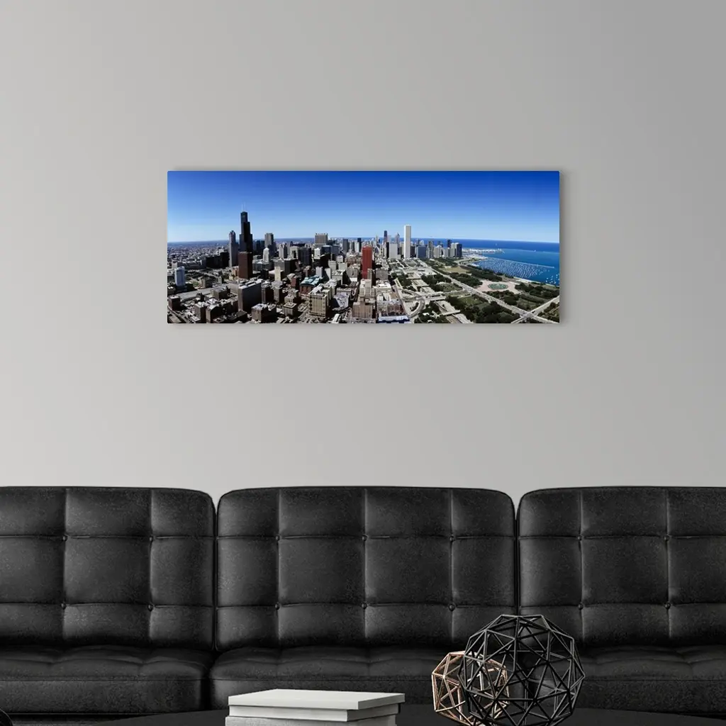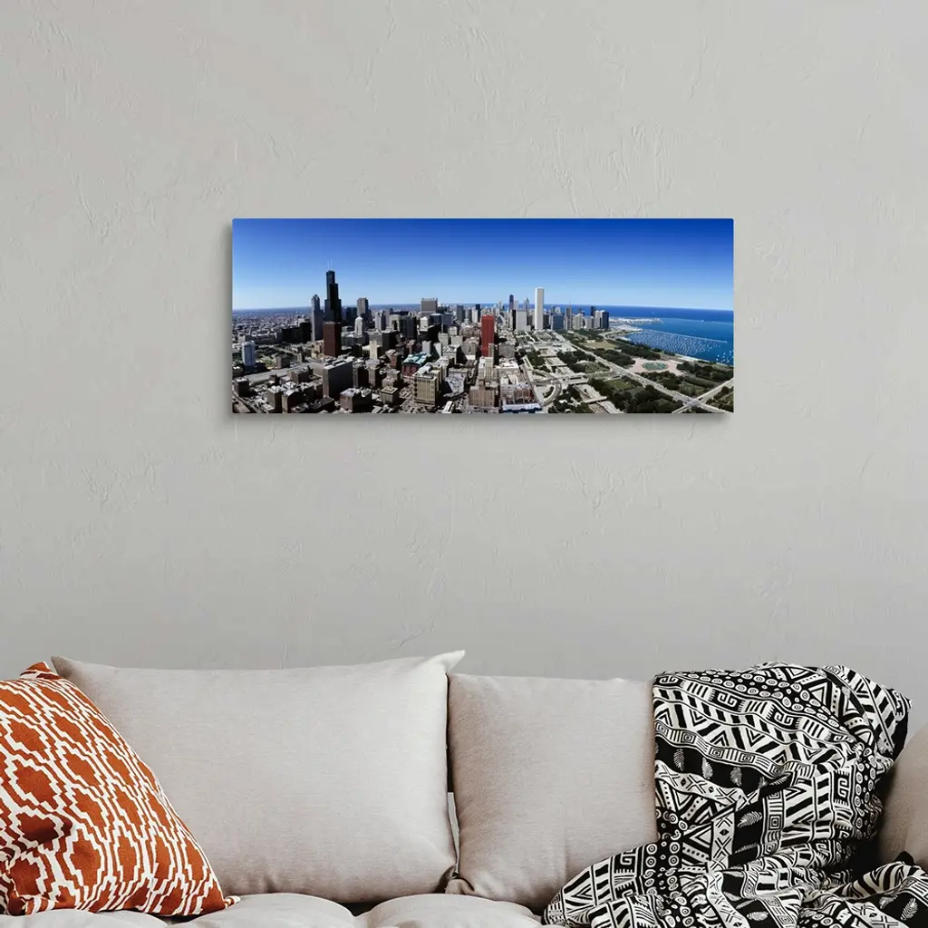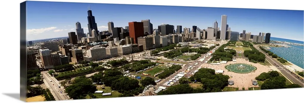 High angle view of buildings in a city, Grant Park, Lake Michigan, Chicago, Illinois wall art for home and office decor. Discover canvas art prints, photos, mural, big canvas art and framed wall art in GreatBigCanvas.com's varied collections.