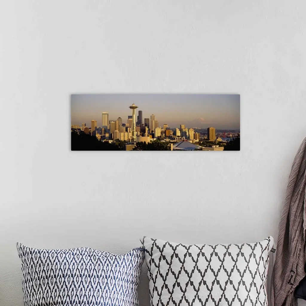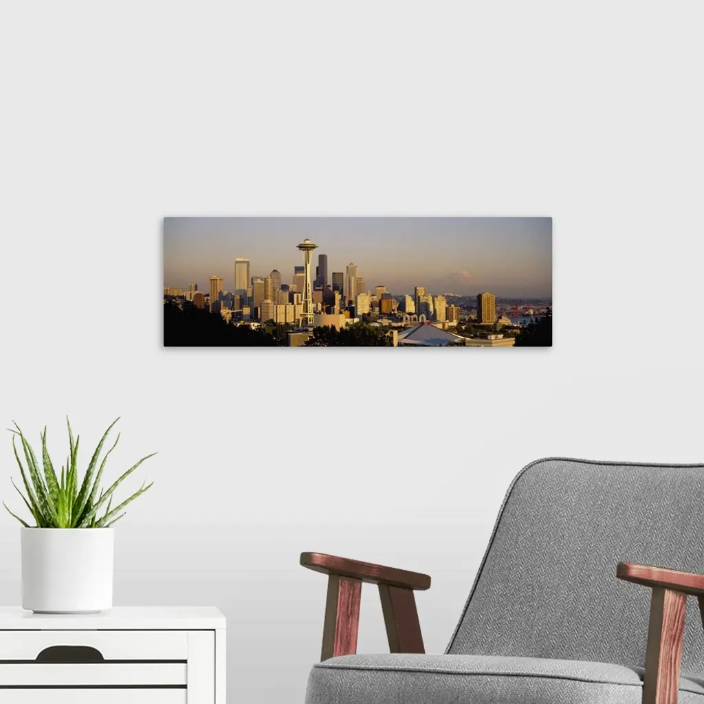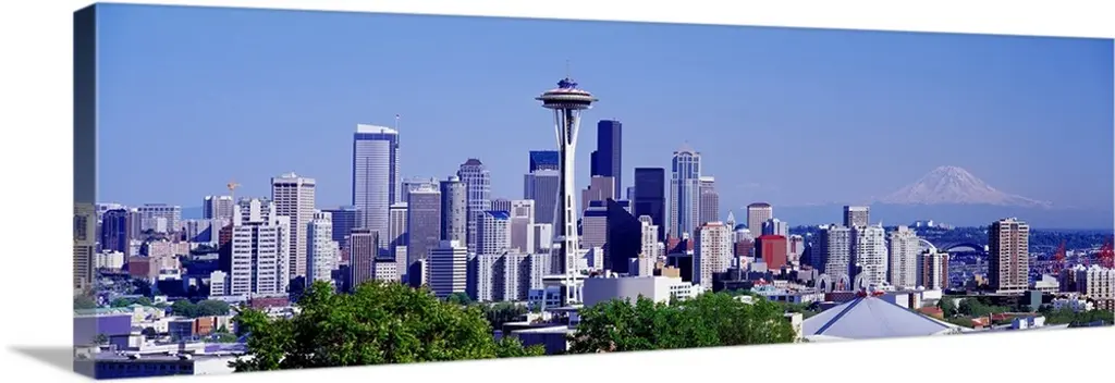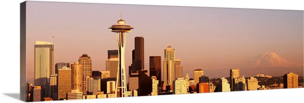 Big, horizontal, high angle photograph of the Seattle skyline, Mount Rainier is slightly visible in the distance.