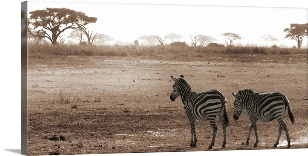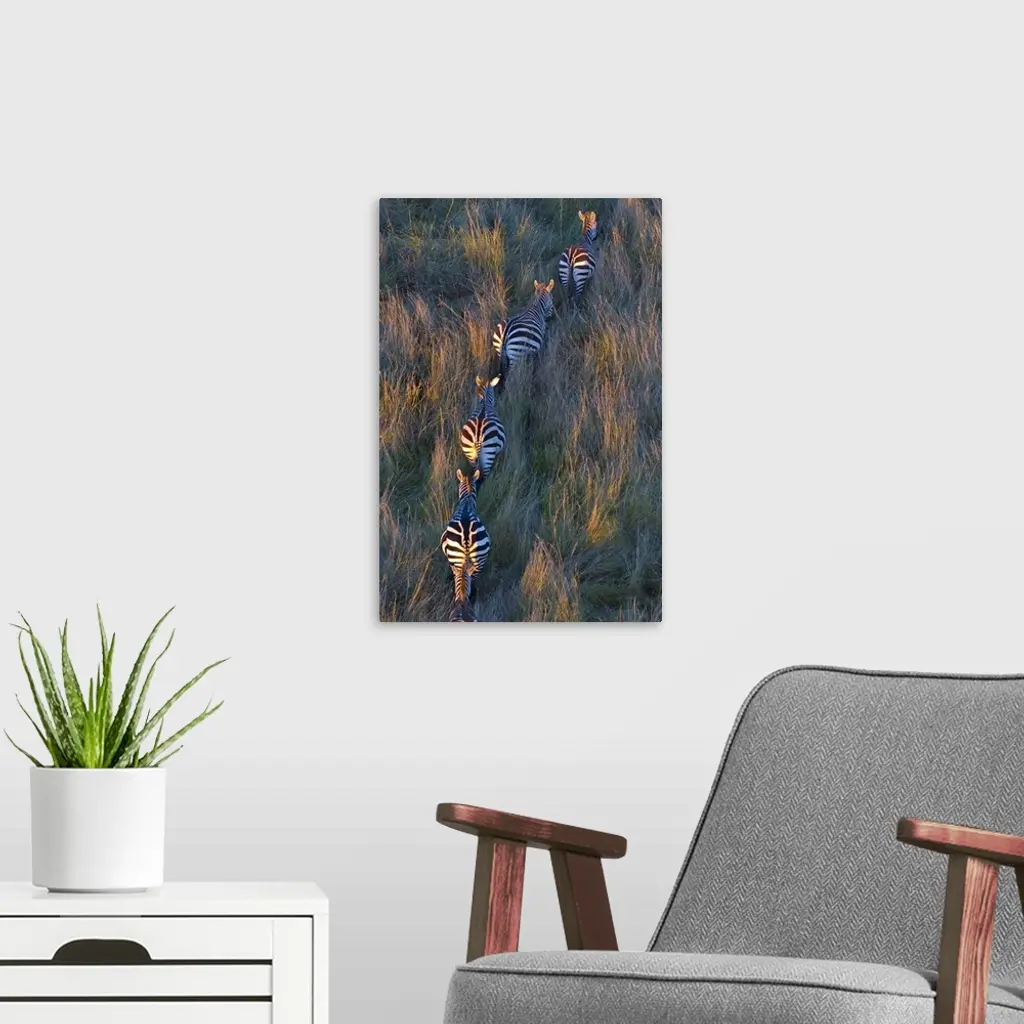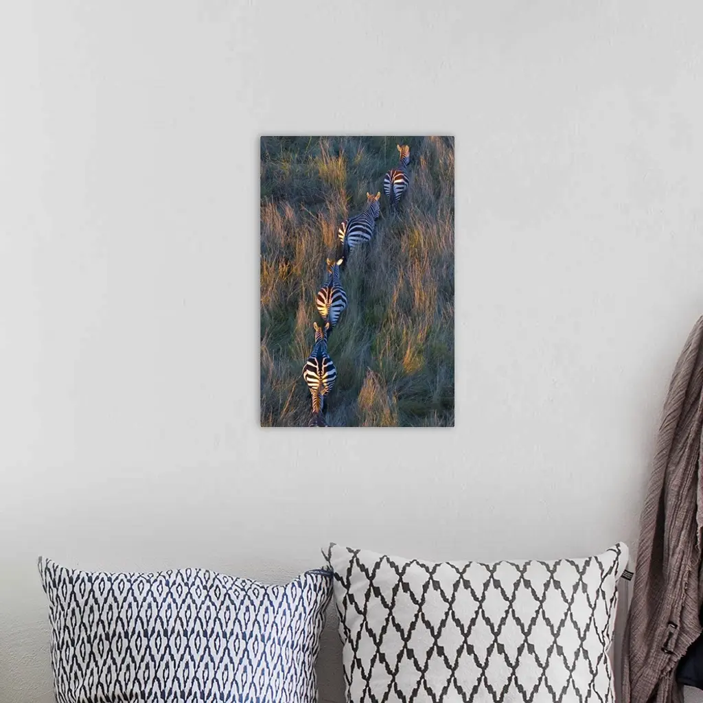 High angle view of five Zebras walking in a row, Masai Mara National Reserve, Kenya wall art for home and office decor. Discover canvas art prints, photos, mural, big canvas art and framed wall art in GreatBigCanvas.com's varied collections.