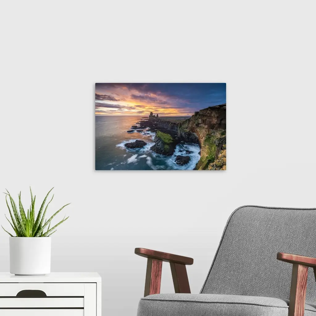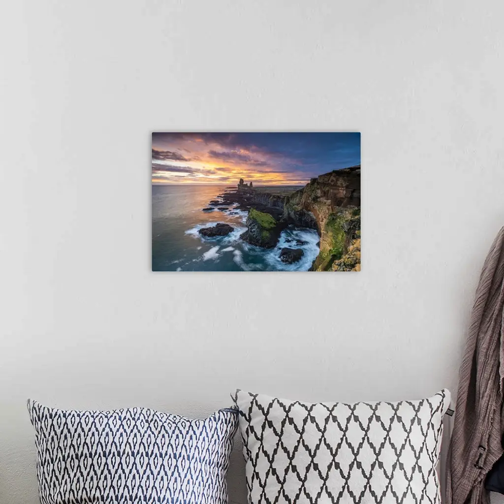 High angle view of Londrangar cliffs during sunset, Snaefellsjokull National Park, Snaefellsness Peninsula, Western Iceland, Iceland.