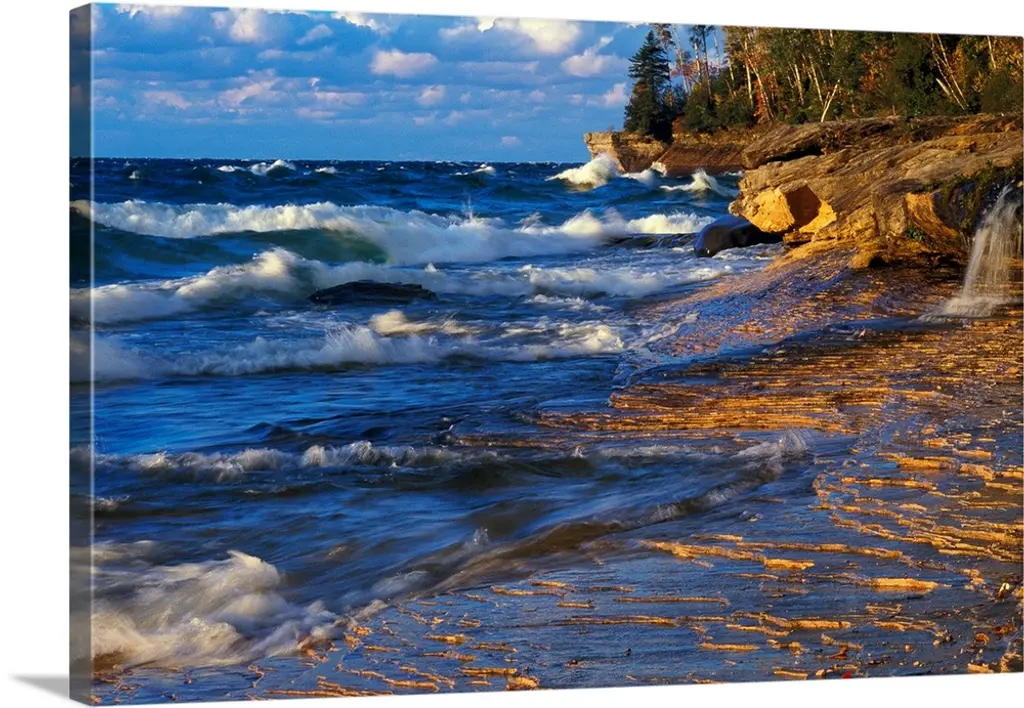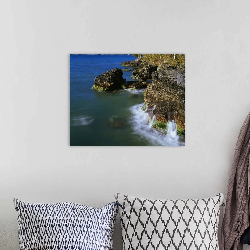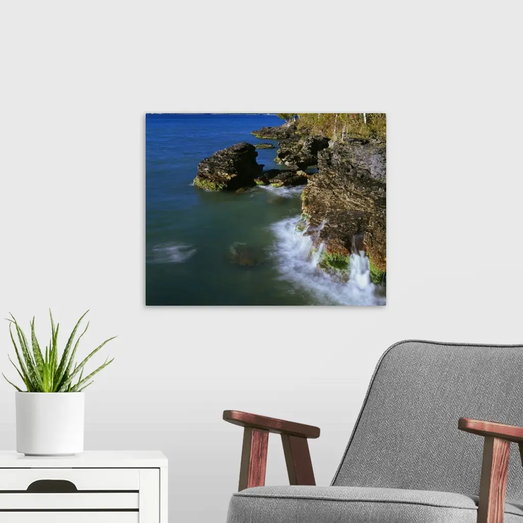 High angle view of rocky shoreline cliffs, Lake Michigan, Whitefish Dunes State Park, Wisconsin wall art for home and office decor. Discover canvas art prints, photos, mural, big canvas art and framed wall art in GreatBigCanvas.com's varied collections.
