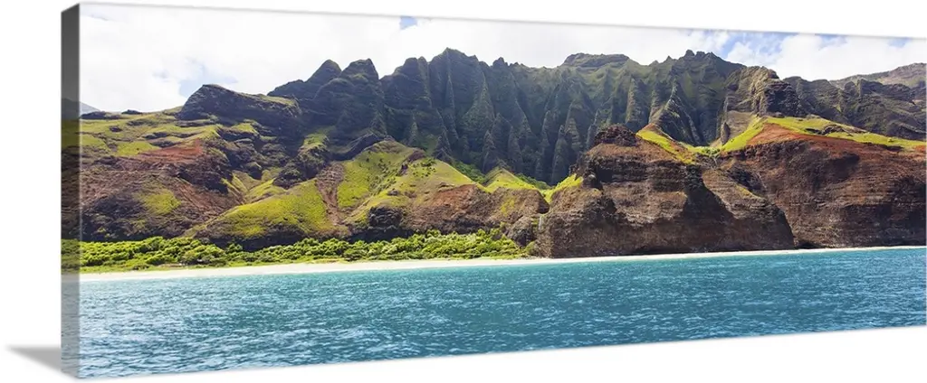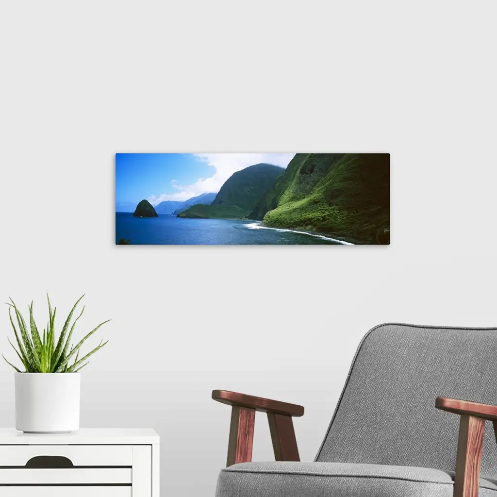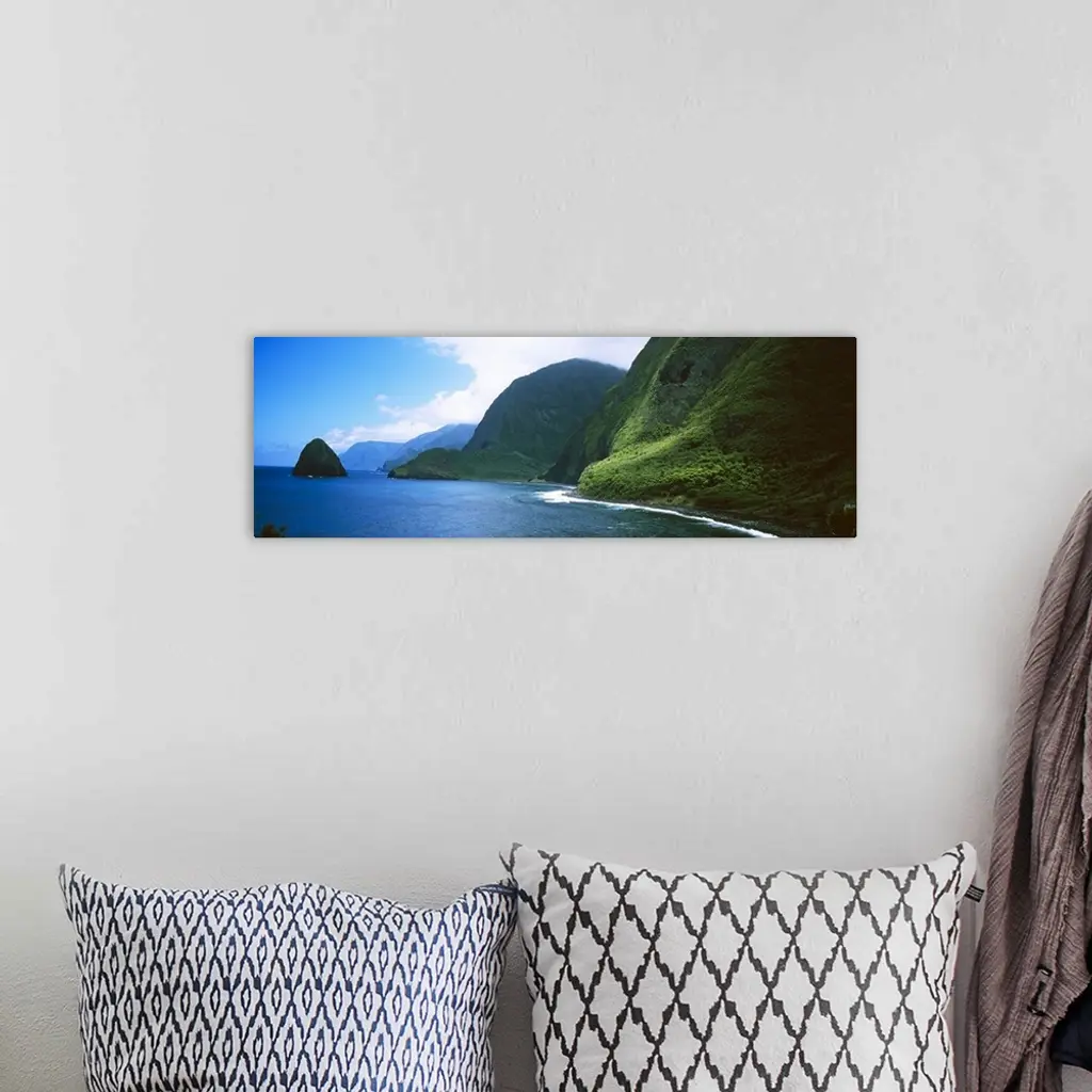 Panoramic photo of large tropical mountains meeting the ocean with a small mountain off shore.