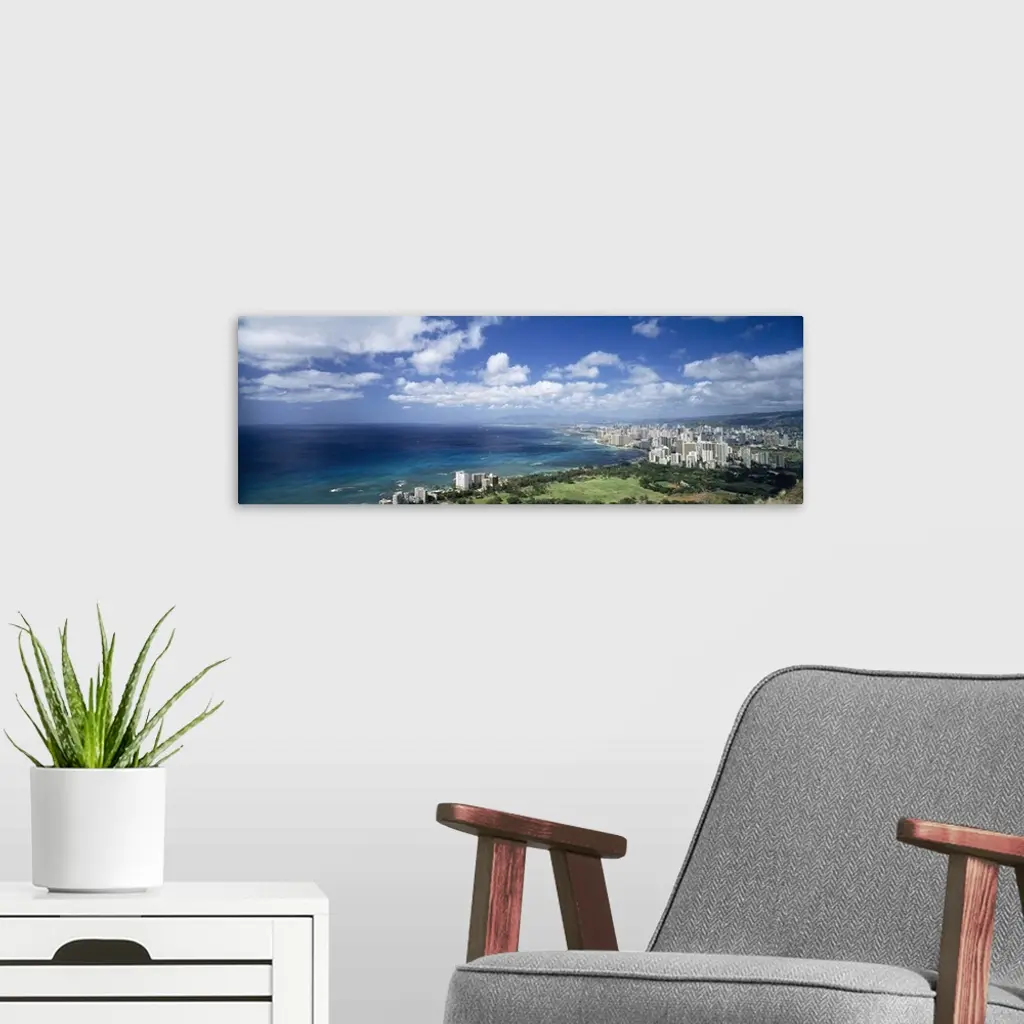 High angle view of skyscrapers at the waterfront, Honolulu, Oahu, Hawaii Islands wall art for home and office decor. Discover canvas art prints, photos, mural, big canvas art and framed wall art in GreatBigCanvas.com's varied collections.