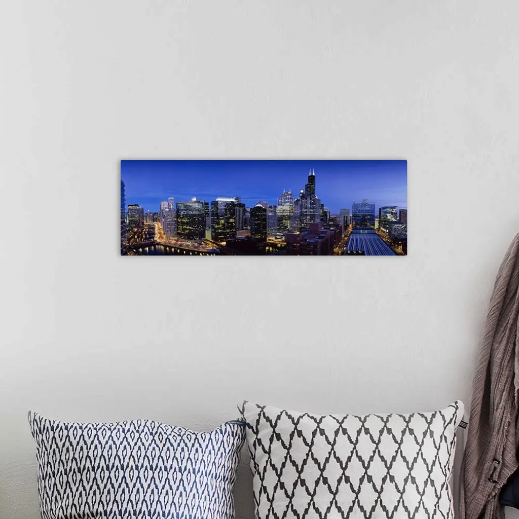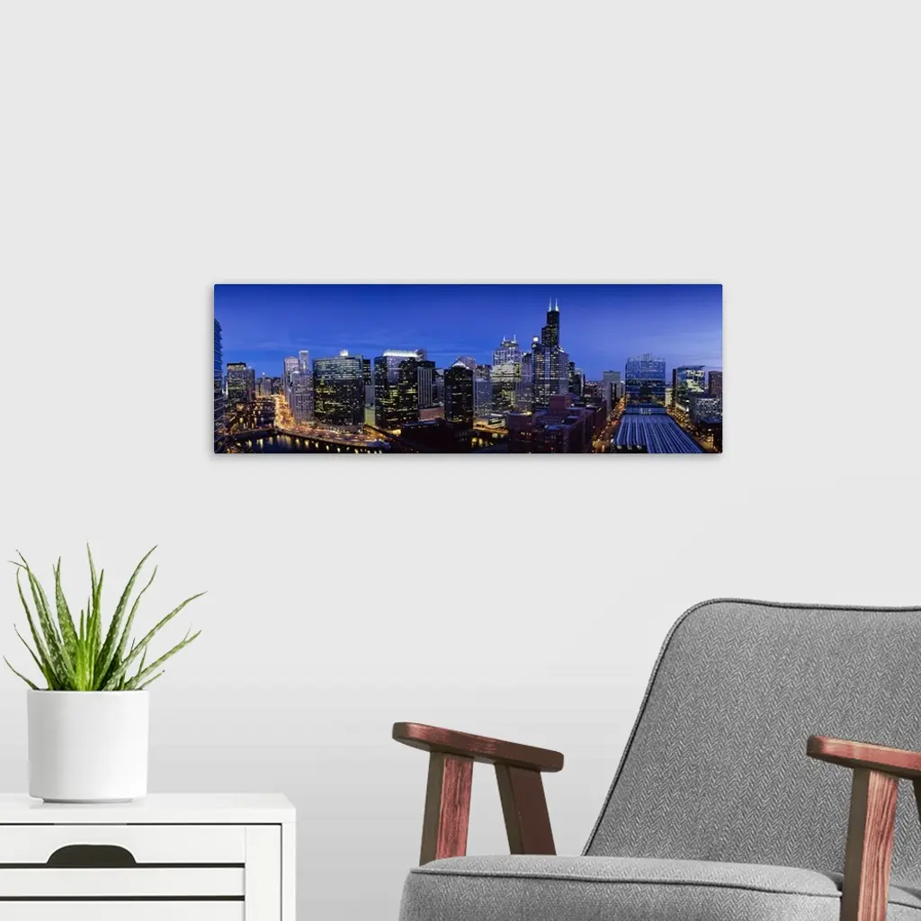 High Angle View Of Skyscrapers Lit Up At Night, Chicago, Illinois