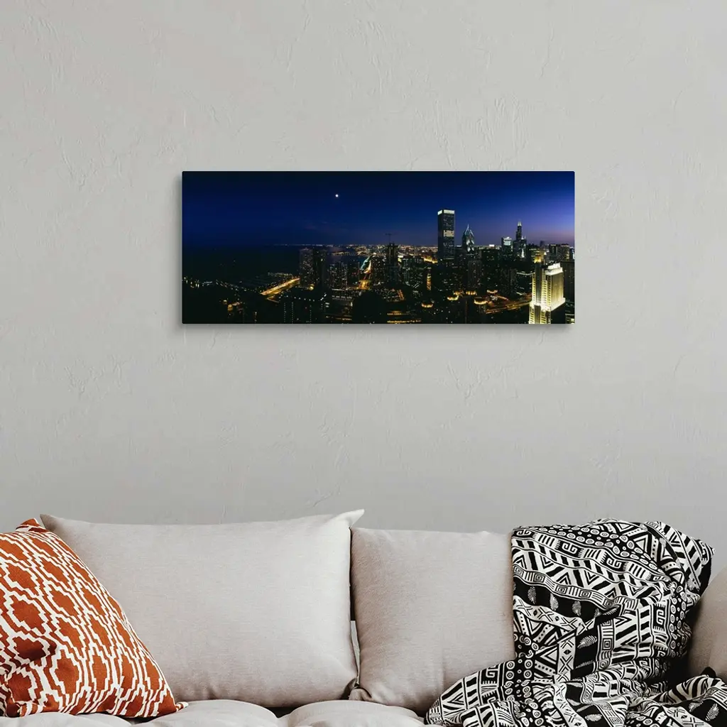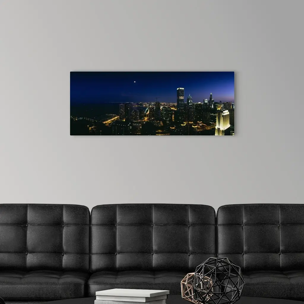 High angle view of skyscrapers lit up at night, Chicago, Illinois wall art for home and office decor. Discover canvas art prints, photos, mural, big canvas art and framed wall art in GreatBigCanvas.com's varied collections.