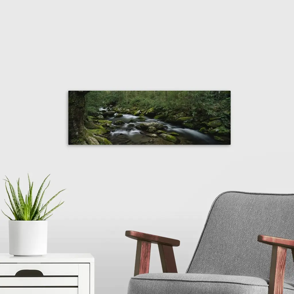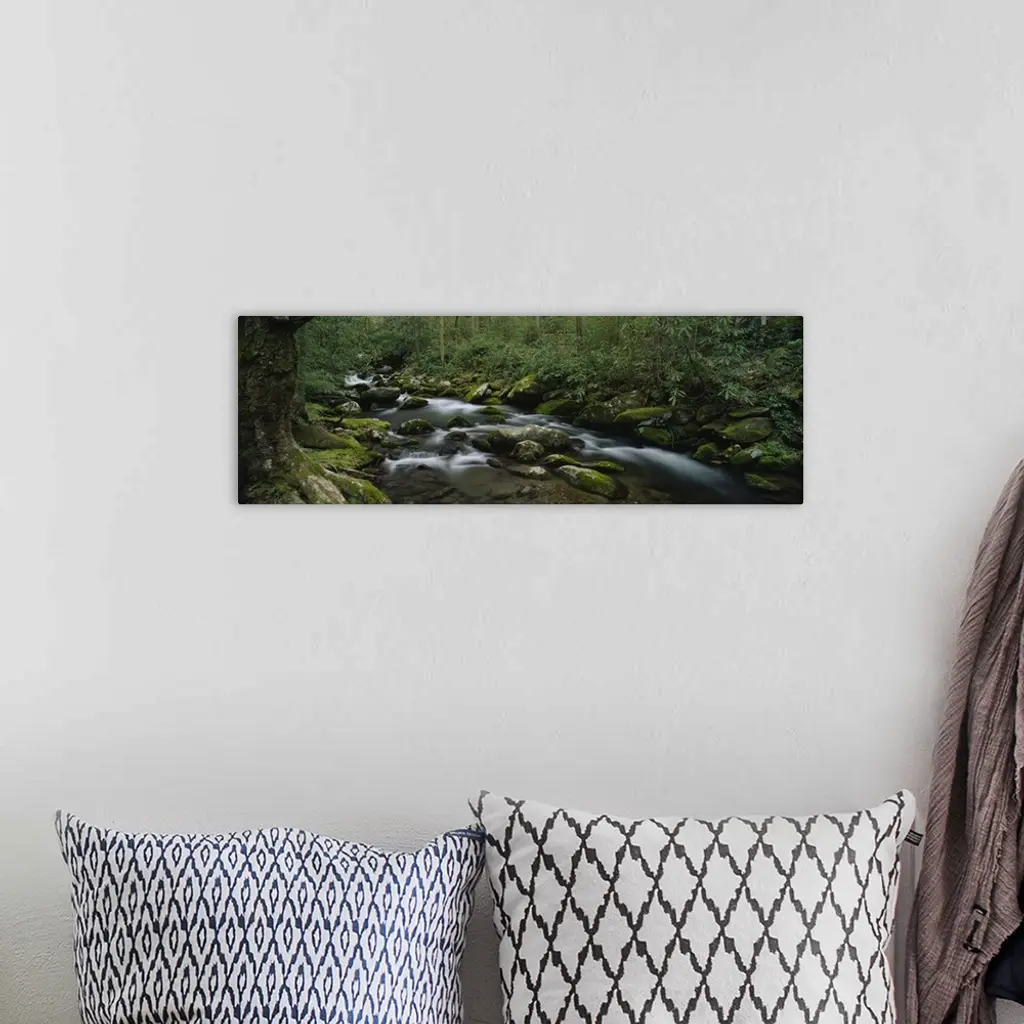 Panoramic photograph on a big canvas of a rocky stream surrounded by a dense, green forest in the Great Smoky Mountains National Park in Tennessee.