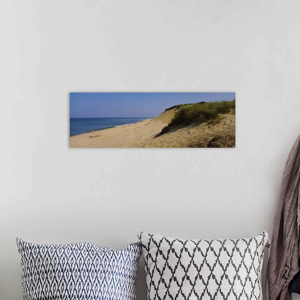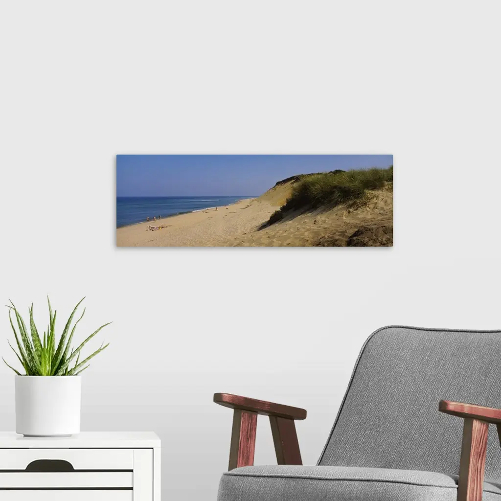 Big, panoramic photograph of a grassy hillside, leading down to the beach and the shoreline where several people walk, at Cape Cod, in Massachusetts, New England.