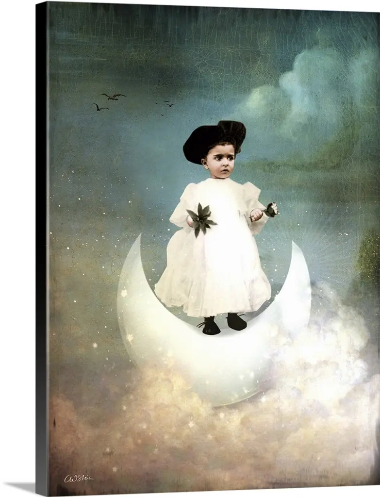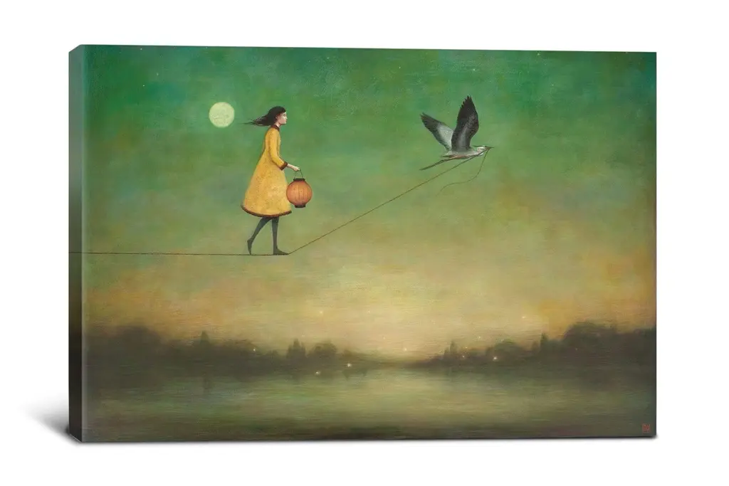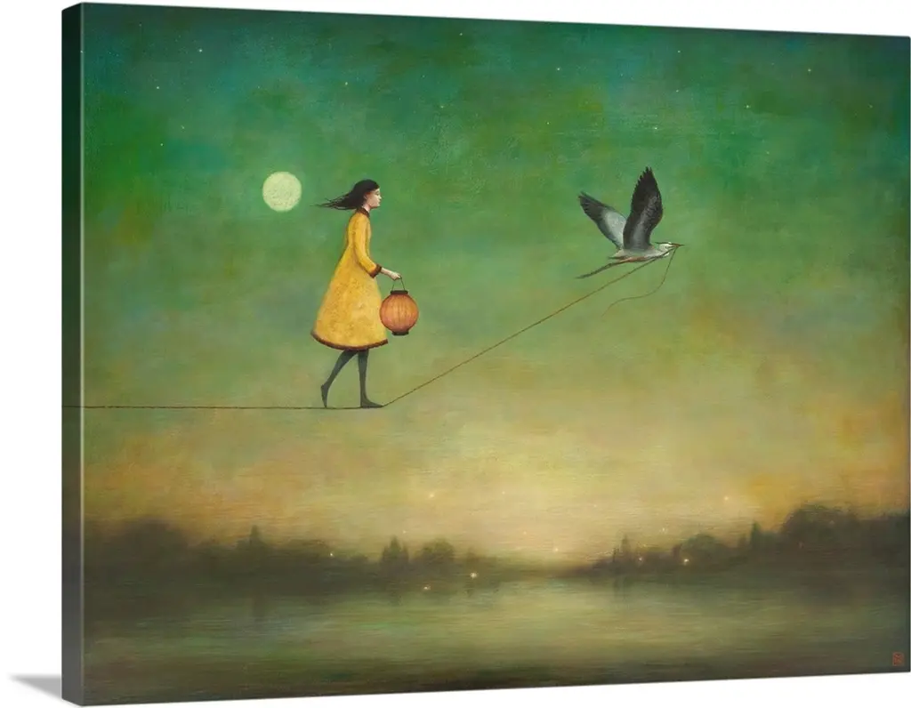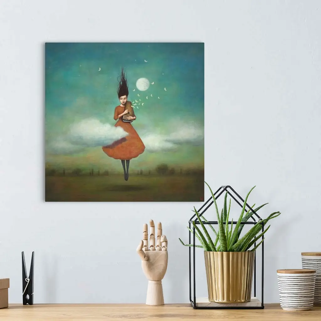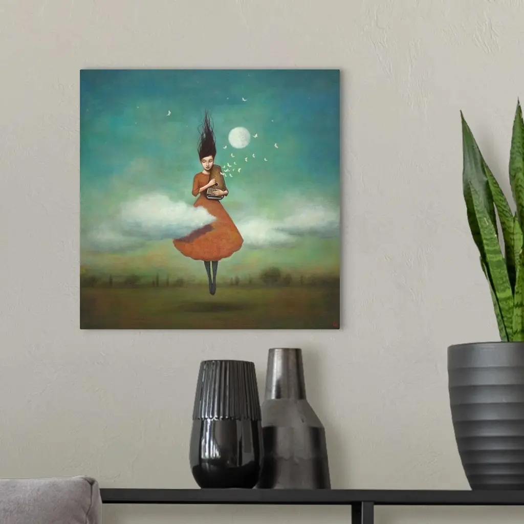 A contemporary surrealist paining of a woman with dark hair and pale red dress holding an instrument levitating off the ground.