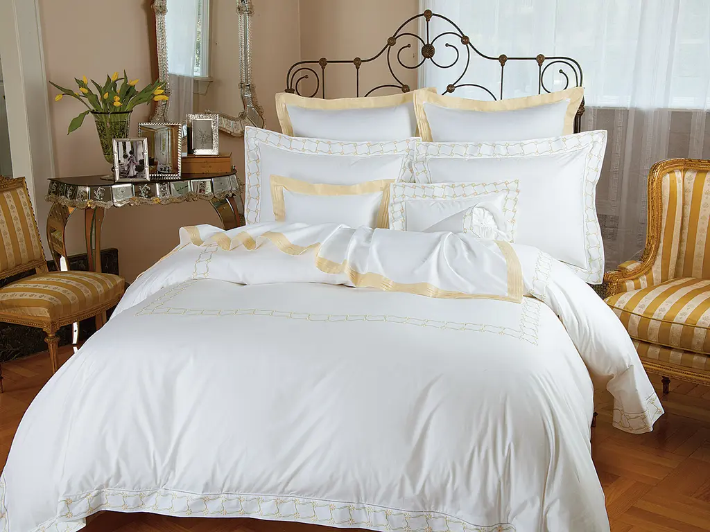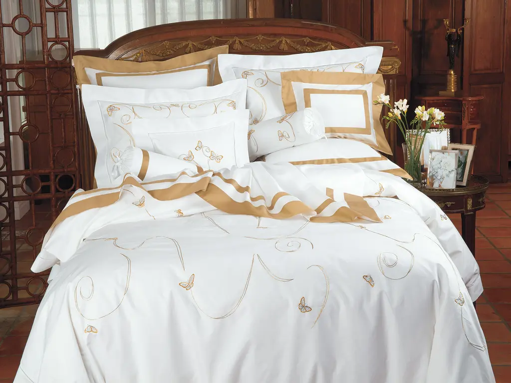 For grandeur of the most impressive kind, these majestic shams and duvet covers are made of a resplendent Viscosa/Bemberg/silk damask. Woven in Italy in monochromatic shadings of Taupe and Gold, then luxuriously tailored in the USA, the extravagance is backed by coordinated pure silk, and heightened by elaborate tassel trim.
