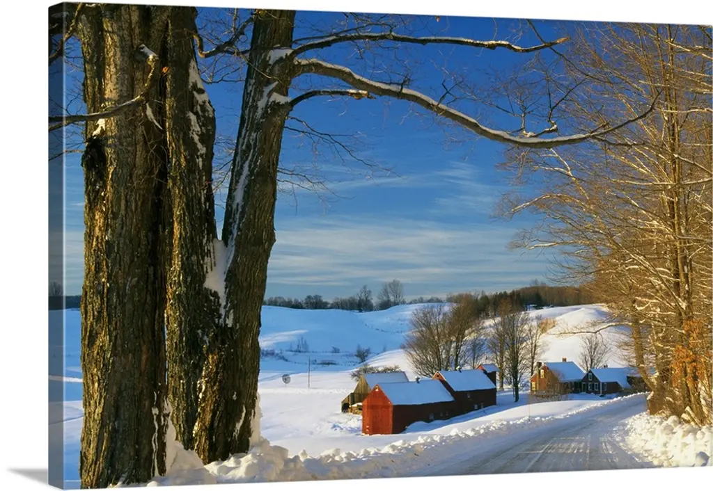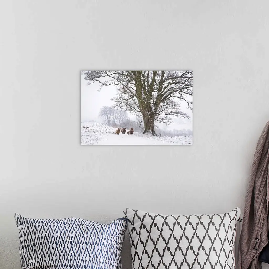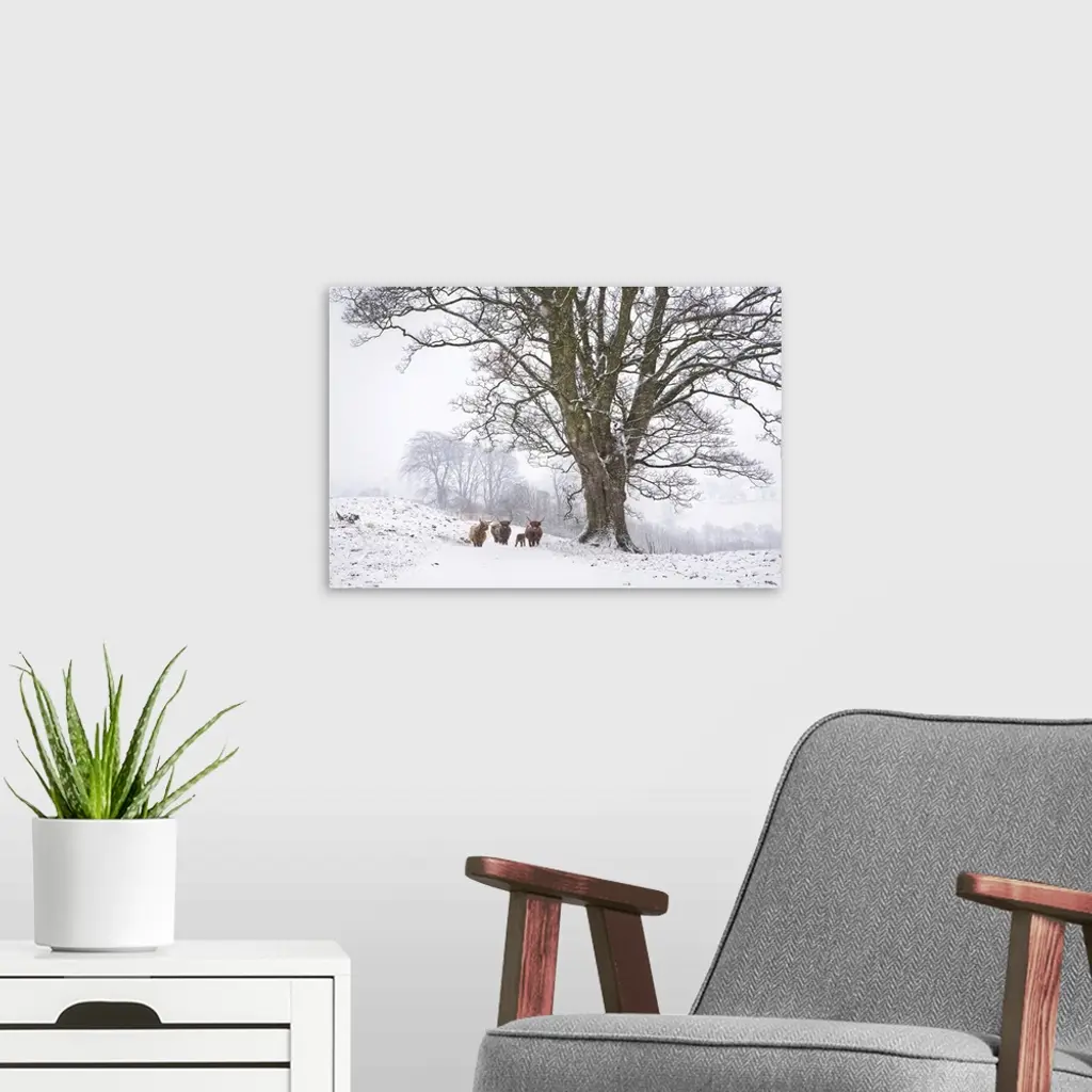 Highland Cattle And Tree In Winter Snow, Yorkshire Dales, Yorkshire, England