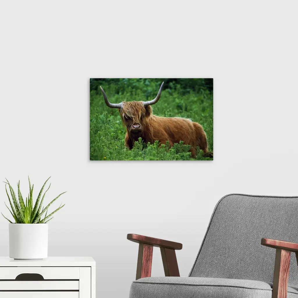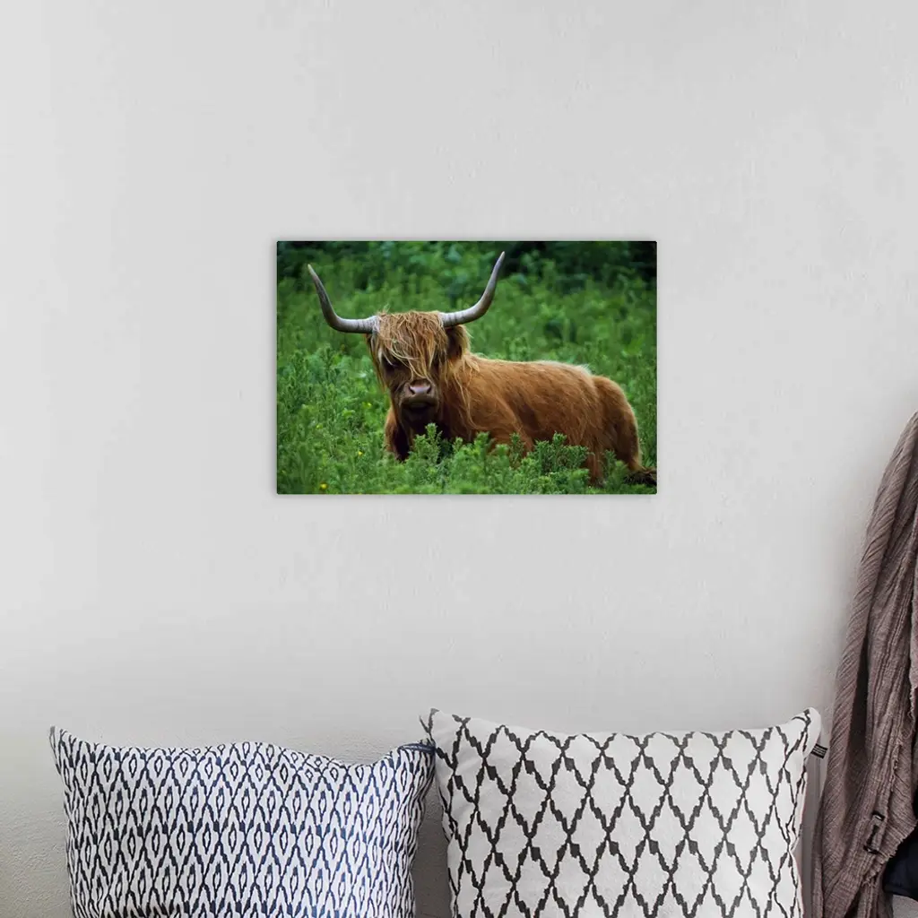 Highland cow in meadow, Scottish Highlands, Scotland. wall art for home and office decor. Discover canvas art prints, photos, mural, big canvas art and framed wall art in GreatBigCanvas.com's varied collections.