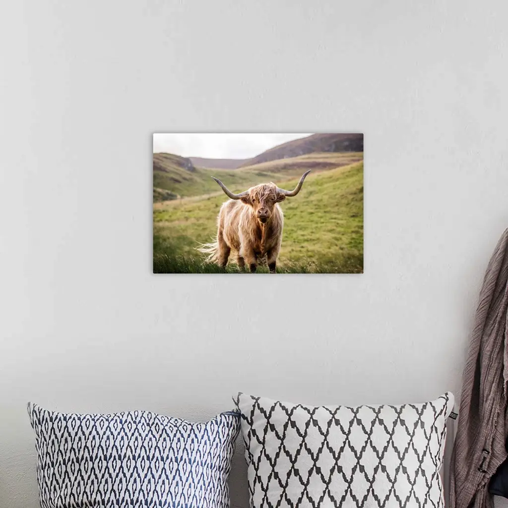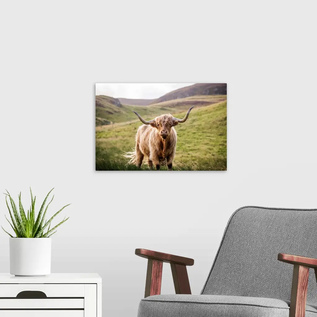 Photograph of a highland cow looking straight at you in the rolling hills of Scotland, UK.