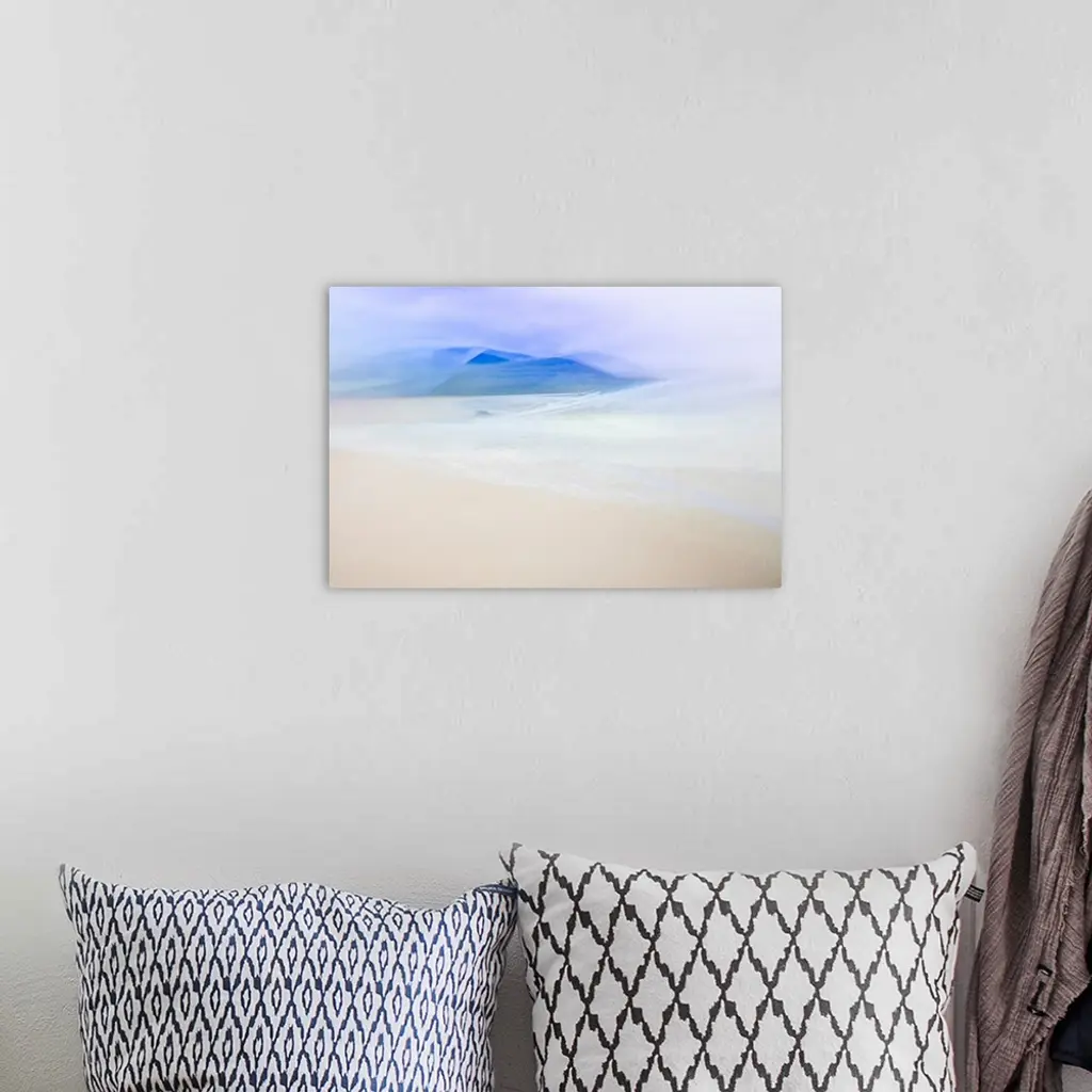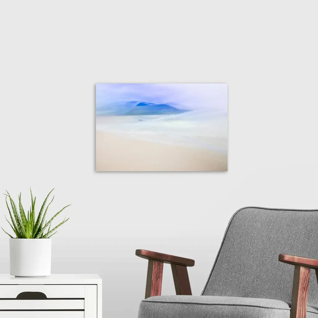 Abstract landscape photo with the ocean faintly washing up on a sandy shore and blue silhouetted mountains in the distance.
