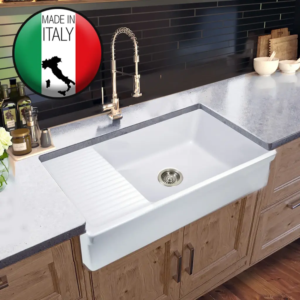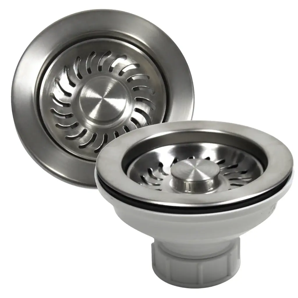 Stainless Steel Sink Drain especially for fireclay sinks. Made in Italy. This drain has and extra long screw that allows it to be used with fireclay sinks whose basins are thicker than other types of kitchen sinks. All the functionality and the reach that you need to complete the look of your fireclay sink. Width fits standard 3.5-inch kitchen sink drain opening.