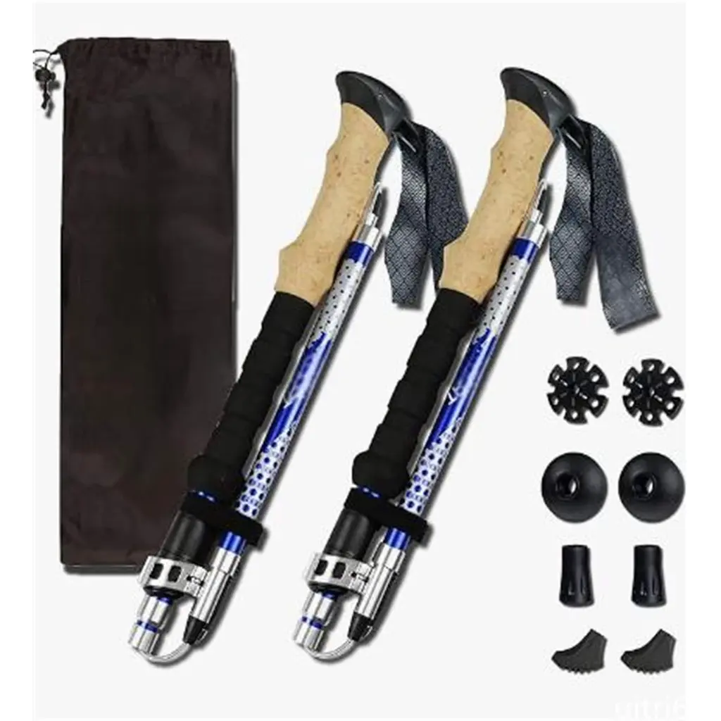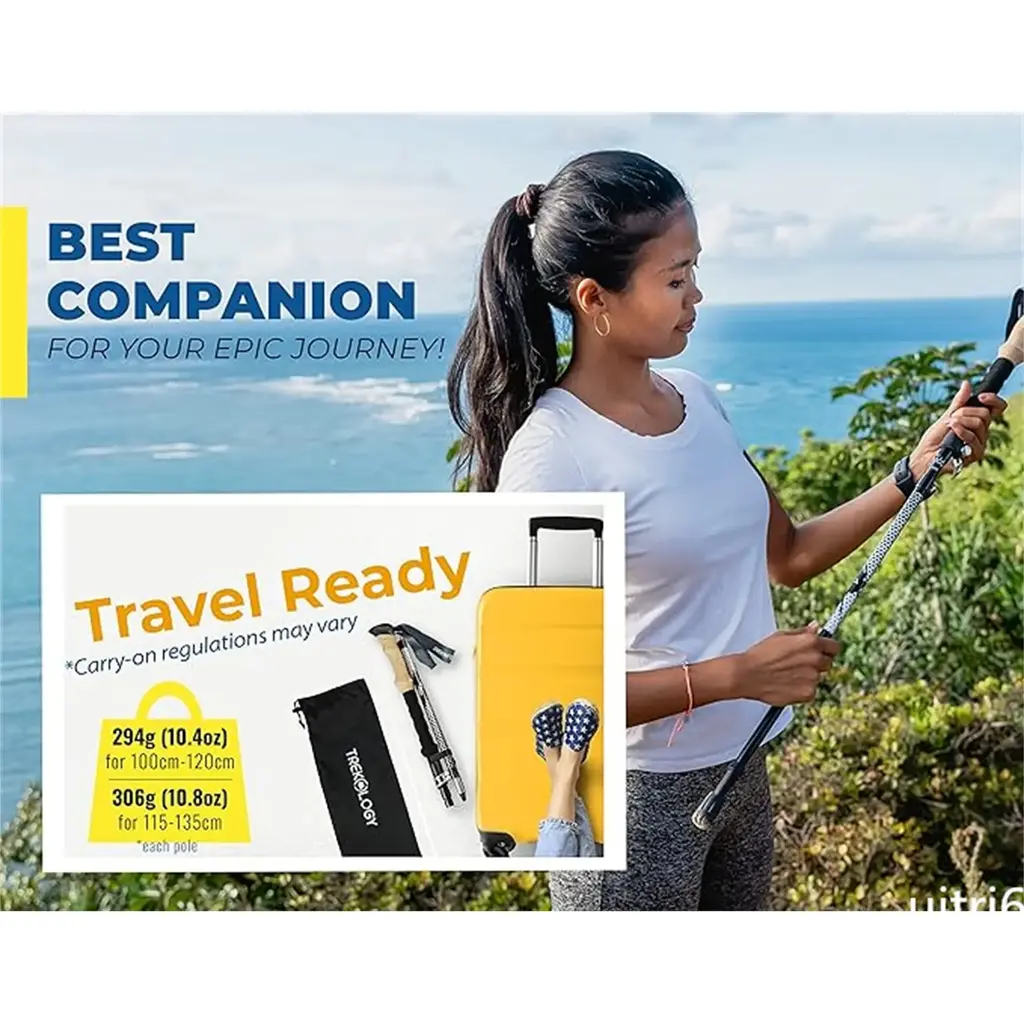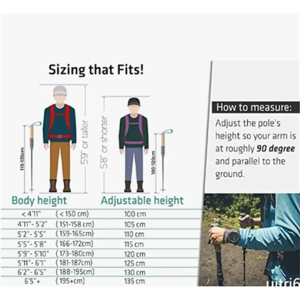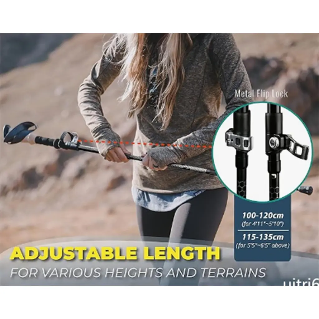 Increase Your Foot Print! Ergonomic Trekking Poles (set of 2) give you reason to increase the steps you take. Providing extra support and walk comfortably with these hiking poles. Cork-texture grip wicks away sweat from hands keeping them drier. Firmer grip in muddy areas with added mud stops. EVA foam shafts allow for a strong grip in extreme all terrain environments. The poles are the perfect gift for outdoor hikers who enjoy light and compact gear! Customizable Trekking Poles for Every Height: Easily adjust your trekking poles with our innovative flip-lock system and secure metal stopper, offering a 20cm adjustment range. Choose the perfect size: 100-120cm for users 5'8" or shorter or 115-135cm for those 5'9" or taller. These poles are designed to suit men, women, and teenagers, making them ideal for any adventure. Each set includes a pair of poles and a convenient holder bag, ensuring you're ready for any trek.