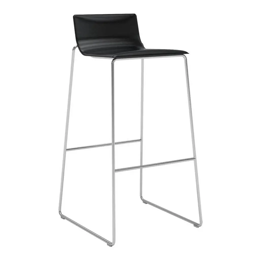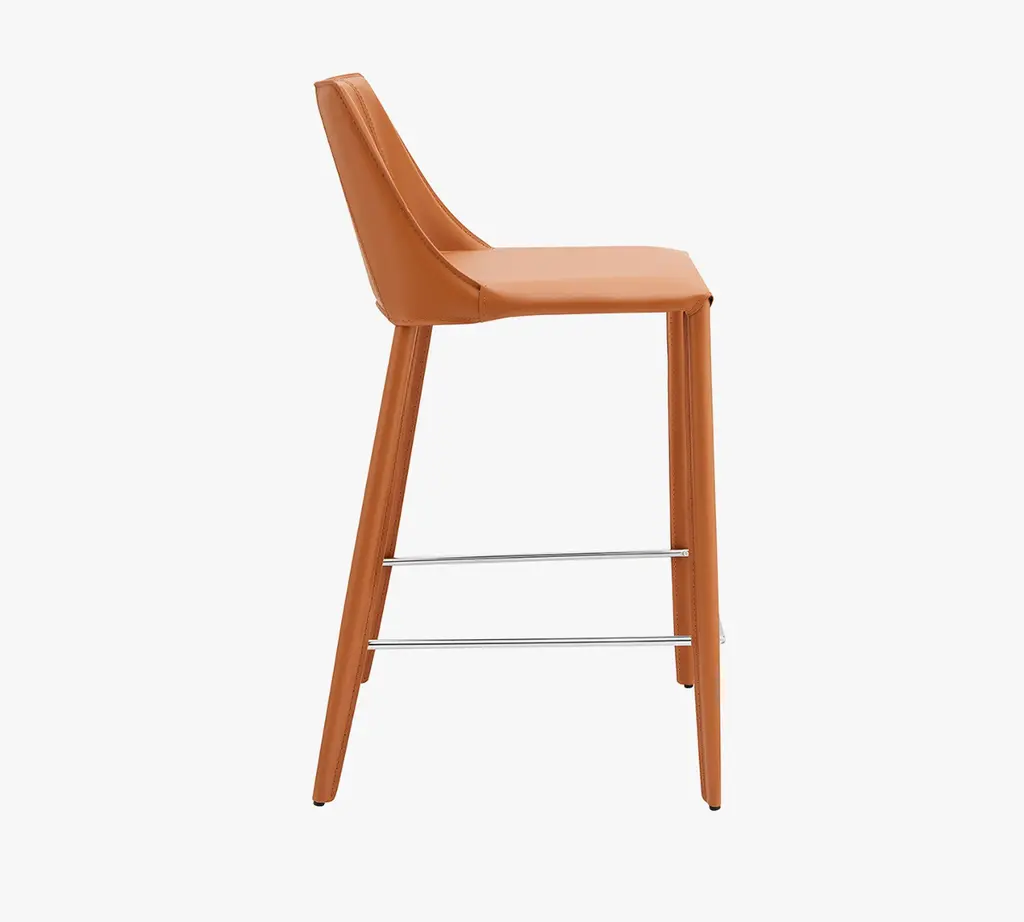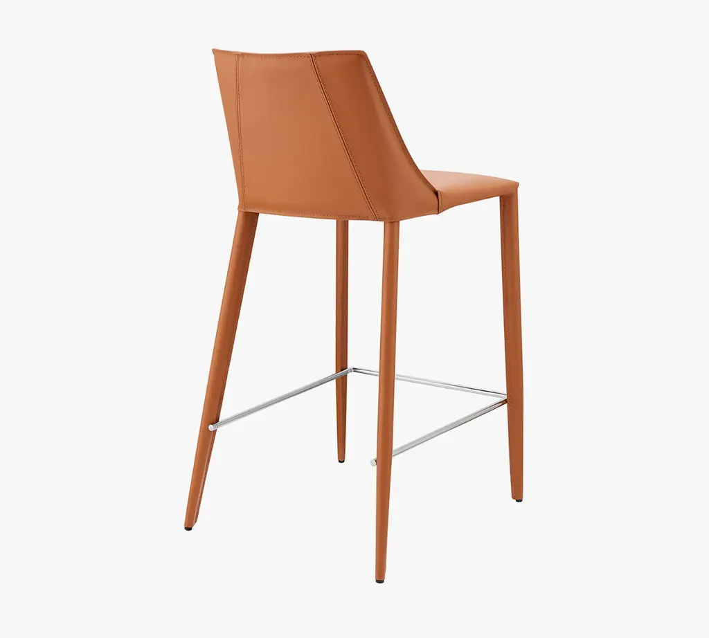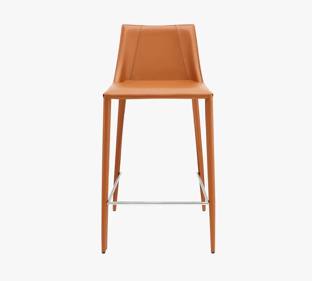 A super-slender silhouette and sleek materials elevate this stool. The sophisticated seat features tight leather upholstery, a subtly contoured back, and long, tapering steel legs.