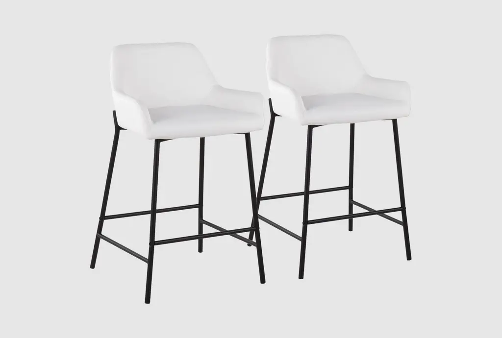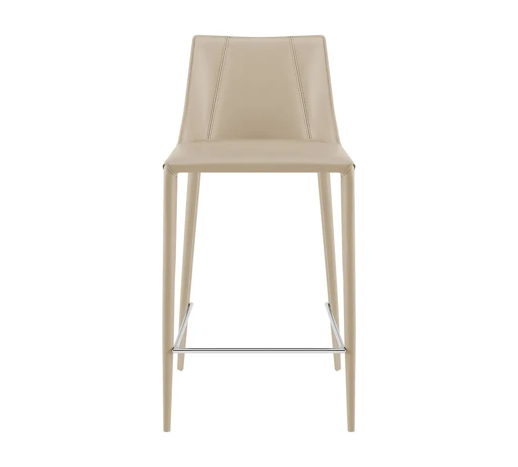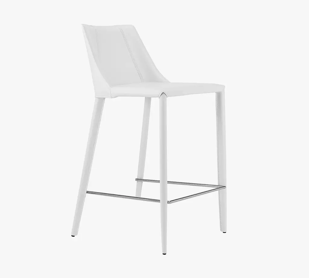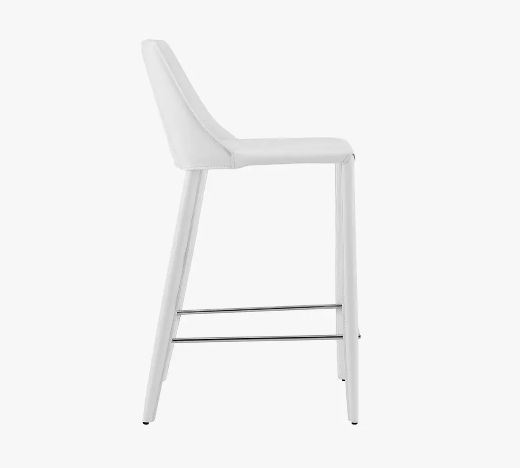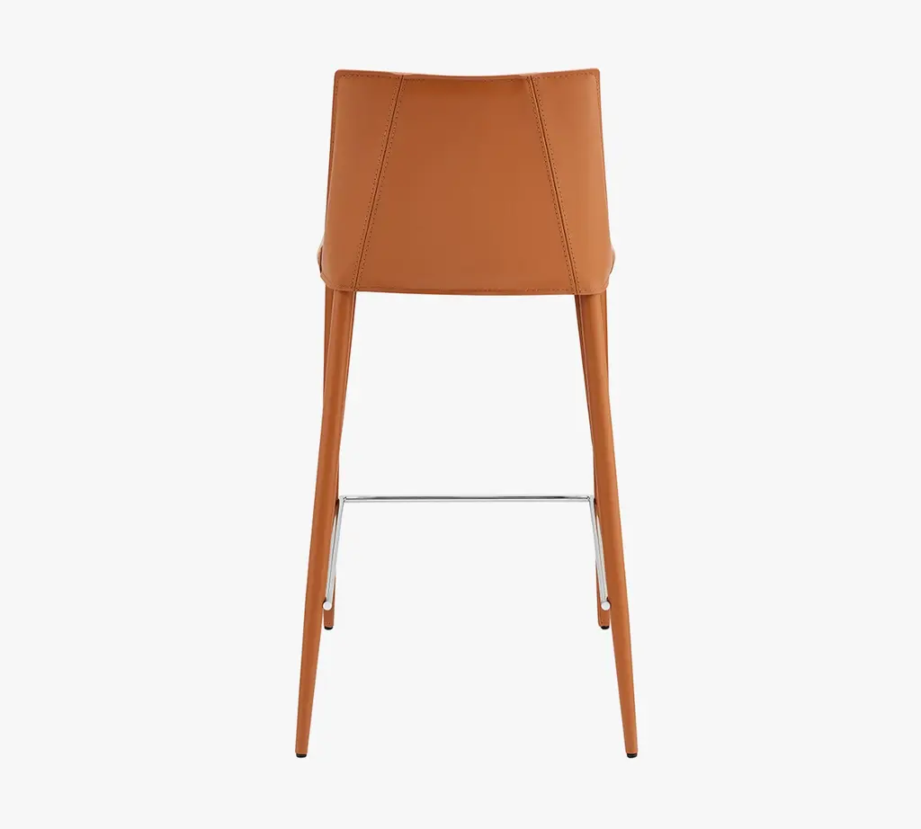 A super-slender silhouette and sleek materials elevate this stool. The sophisticated seat features tight leather upholstery, a subtly contoured back, and long, tapering steel legs.