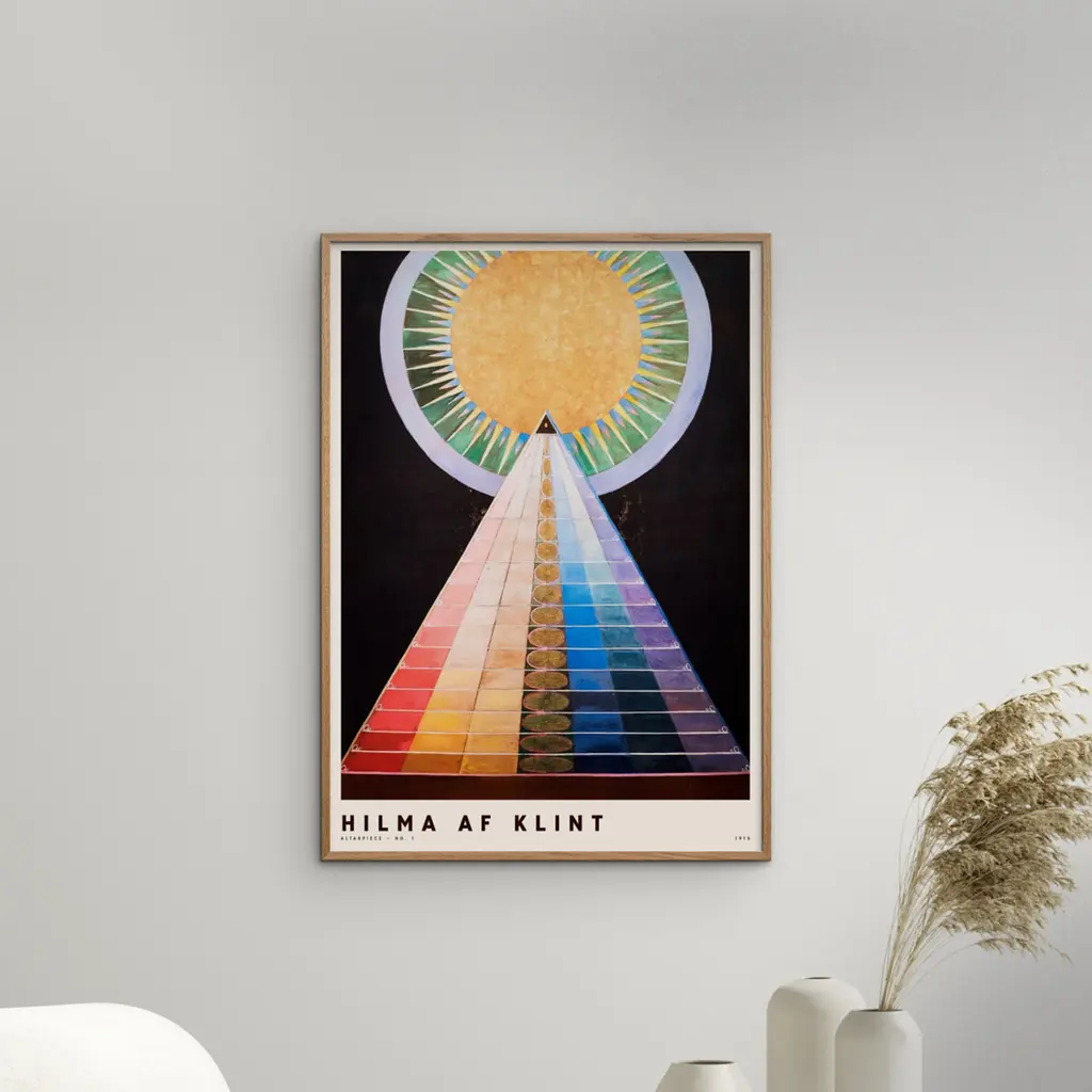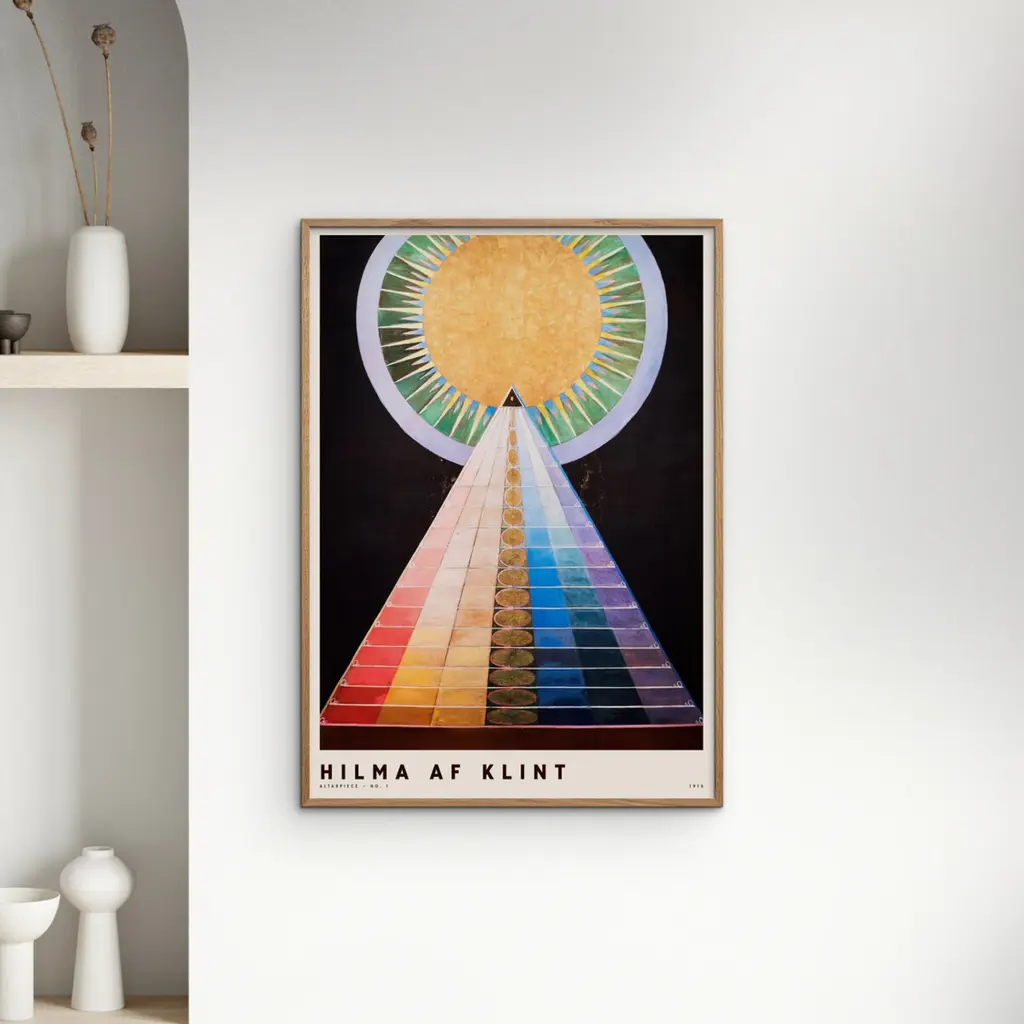 Add artistic intrigue to your space with Hilma af Klint’s "Altarpiece No. 1 – 1915." This striking piece features a radiant sun and vibrant pyramid, symbolizing spiritual enlightenment. The harmonious intersection of round and triangular shapes instills a sense of calm in the viewer. Unframed. Available in three sizes.