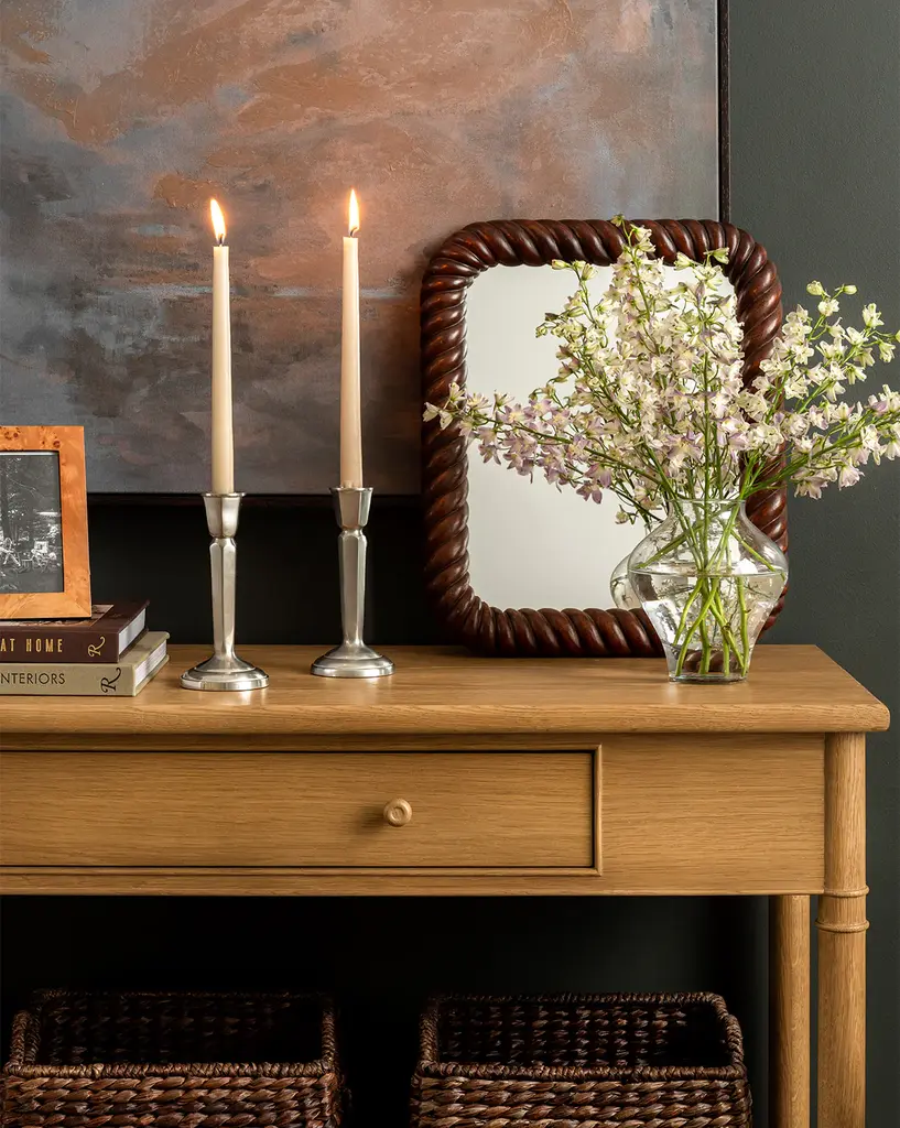 The Hindley Console embodies timeless design with its warm oak finish, spindle-inspired legs, and streamlined silhouette. A spacious drawer and lower shelf offer both storage and display, making it a versatile piece for an entryway, dining room, or living space with understated elegance.