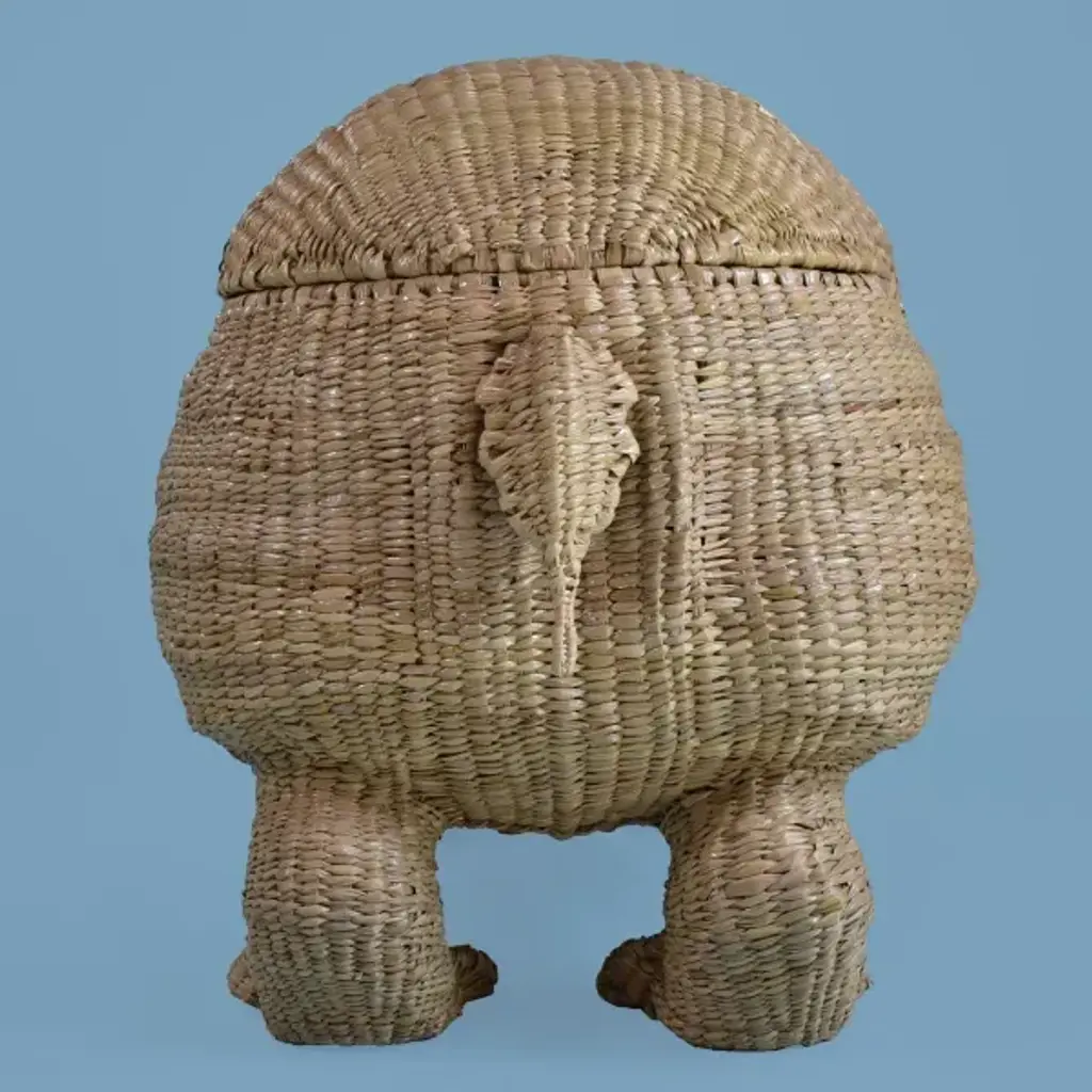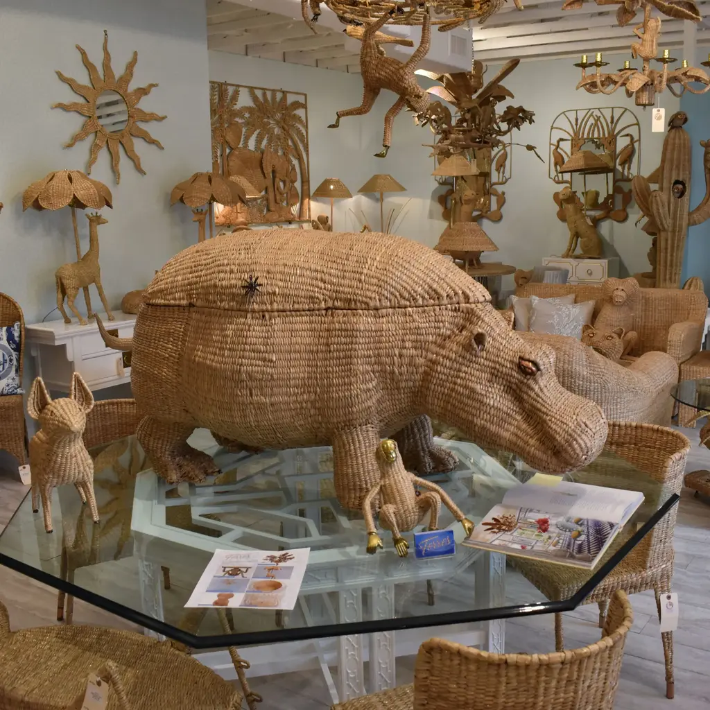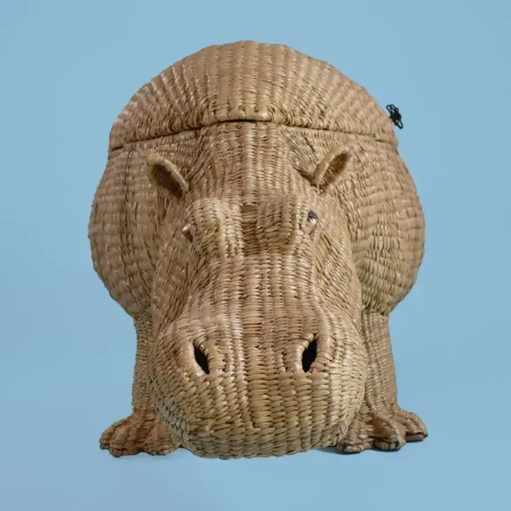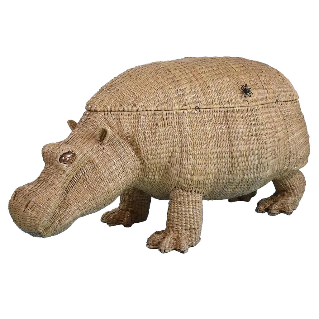 Mario Lopez Torres Hippopotamus. There are minor imperfections to the hand-made woven rattan. Signed Mario Lopez Torres Est. 1974. Brass accents, top opens. (see photos)