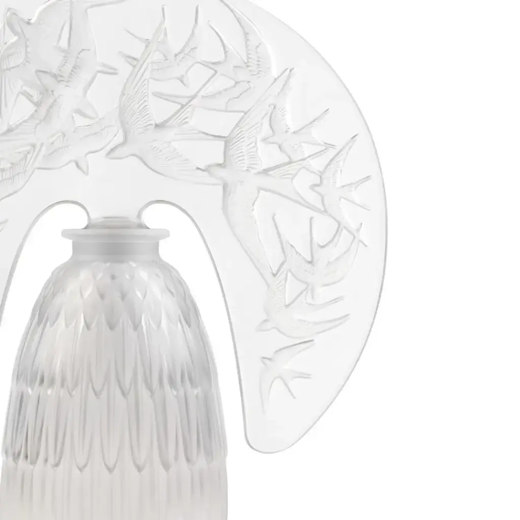 Celebrating the 130th anniversary of the Maison, the new collection takes us to the heart of the immeasurable heritage built by its founder. Through his work, René Lalique explored the decorative possibilities of flora, fauna and the female form. Among fauna, the swallow particularly inspired him, which he then made the centrepiece of many jewels and decorative objects. With admiration and respect for this immense artist, Lalique reinterprets the figure of the swallow, recurring in the Master’s work, herald of spring, symbol of happiness and freedom Reminiscent of René Lalique's famous tiara perfume bottles, the majestic tiara adorned with swallows is placed on the body of the lamp displaying a motif inspired by the Plumes bottle. Trained as a jeweler at the Ecole des Arts Decoratifs in Paris in the late 1880's, Rene Lalique gained recognition as an independent designer for some of the era's great jewelry houses including Cartier and Boucheron. Eventually, he turned to glassmaking, and his techniques were a triumph for the Art Deco movement. Every piece of Lalique is finely detailed and produced by hand in Alsace, France.