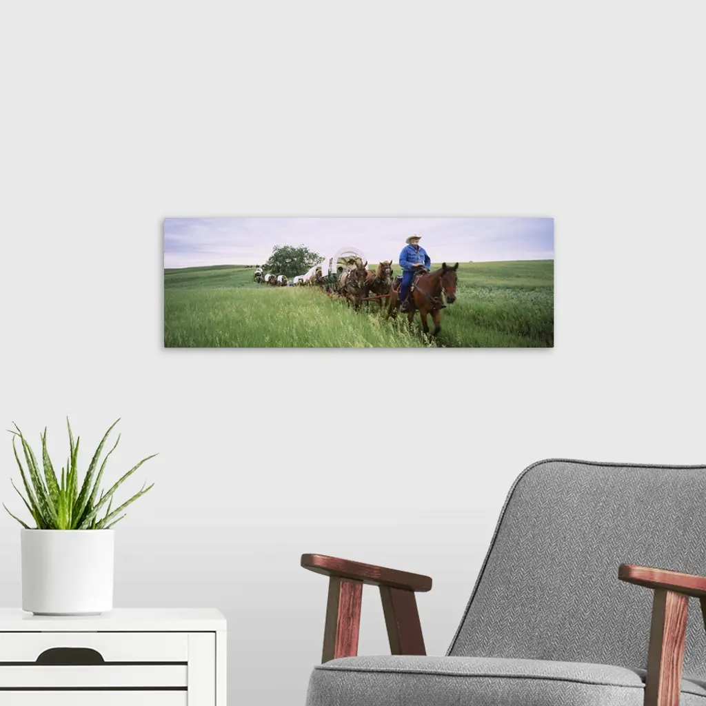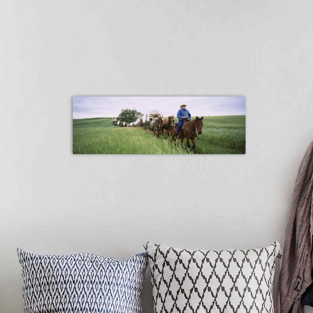 Historical reenactment of covered wagons in a field, North Dakota wall art for home and office decor. Discover canvas art prints, photos, mural, big canvas art and framed wall art in GreatBigCanvas.com's varied collections.