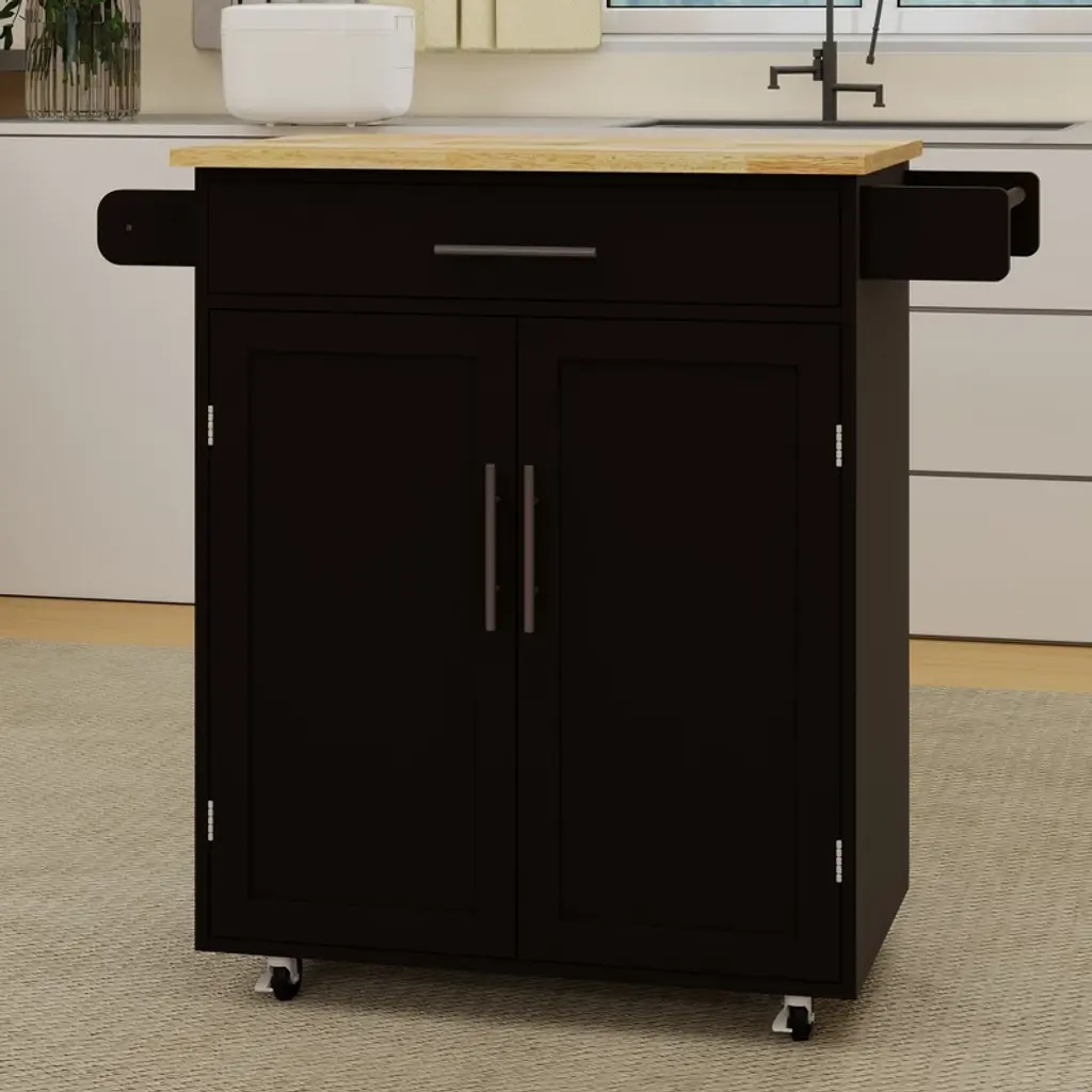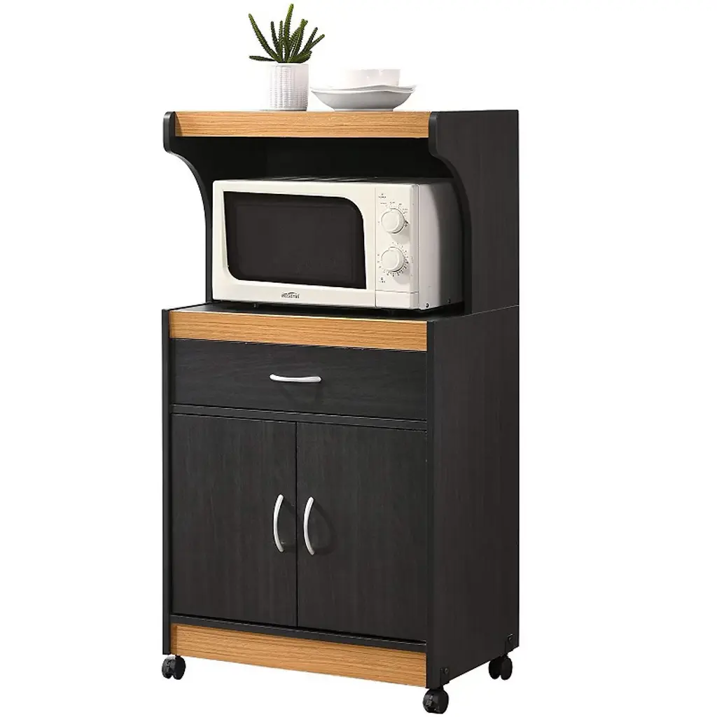 The Hodedah Wheeled Microwave Cart with Drawer and Cabinet Storage is the ideal solution for limited kitchen space in your home or office. This stunning, black and beech microwave cart will make a functional yet stylish addition to your home or office. Wheels with locking casters allow you to easily move the cart to find the perfect spot and lock it into place once you have. The pull-out drawer and cabinet space below give you all the storage you'll need for utensils and dinnerware. The top of the cart functions as an island for more useable space. Although designed for a microwave, this handy cart also works perfectly for toasters, coffee makers, or other small kitchen appliances.