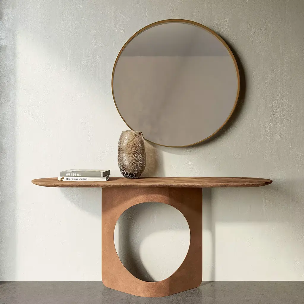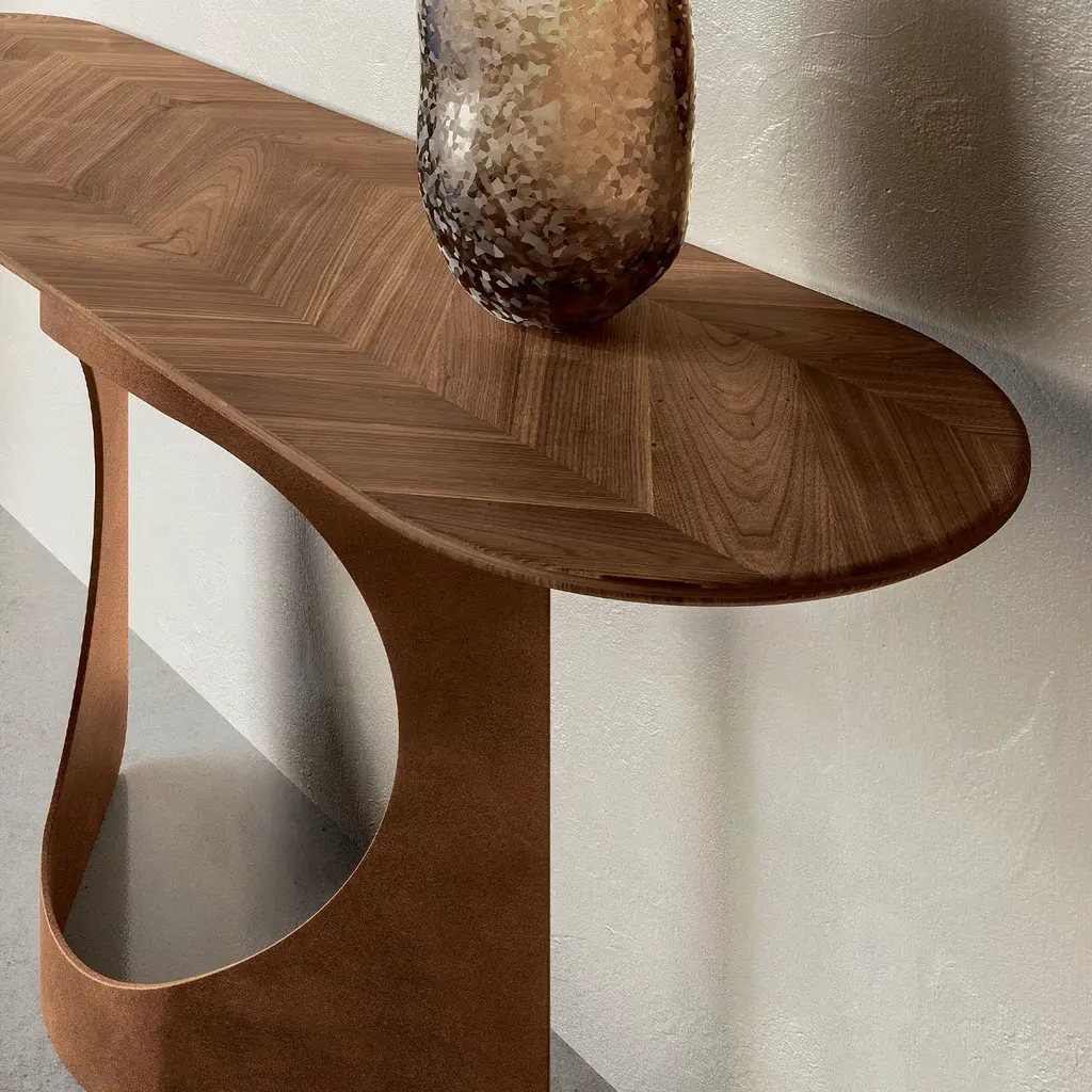 A sculptural silhouette defined by refined geometric details marks this console, a freestanding design ideally complementing contemporary entryways. Resting on a curved copper-finished metal base distinguished by a circular hole, the prized Canaletto walnut top flaunts a herringbone pattern enhanced by the protective scratch-resistant "Havana" finish. Multiple variants are available in the Artemest catalog.