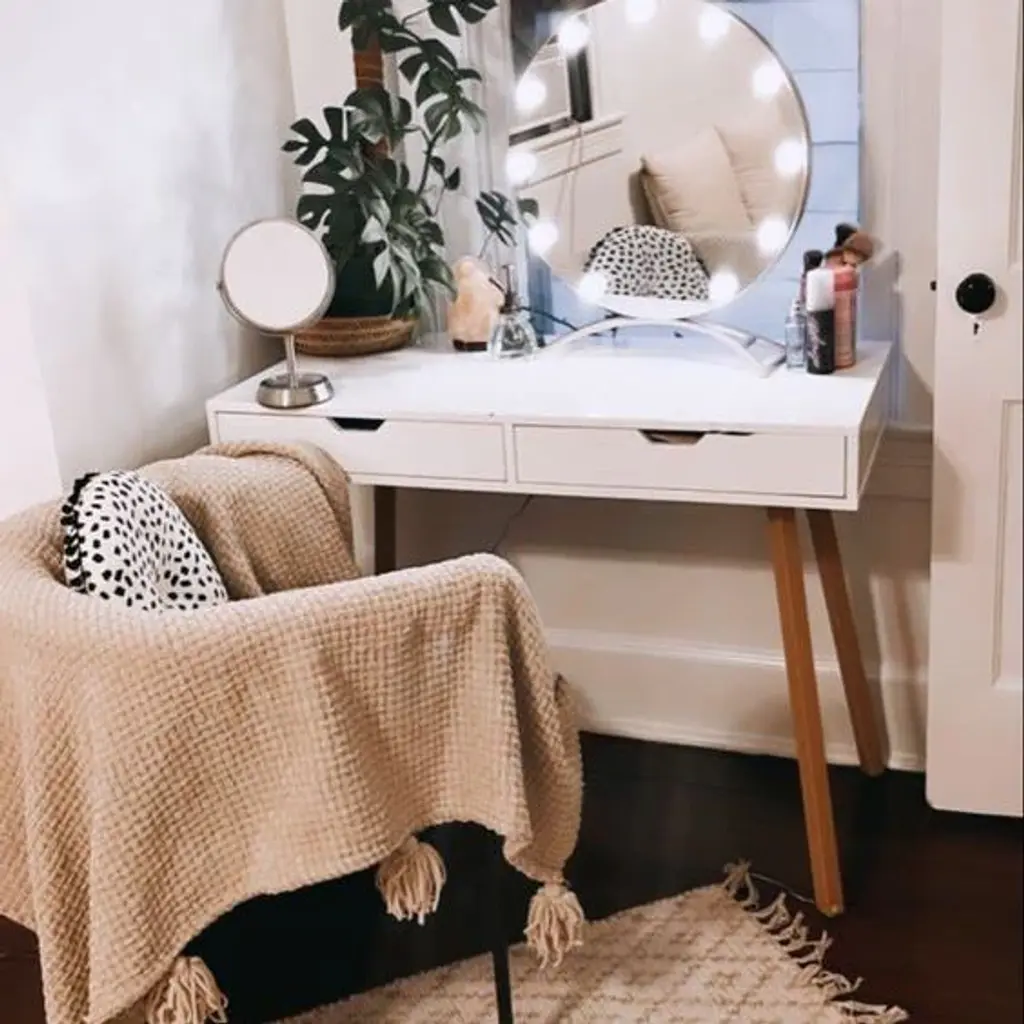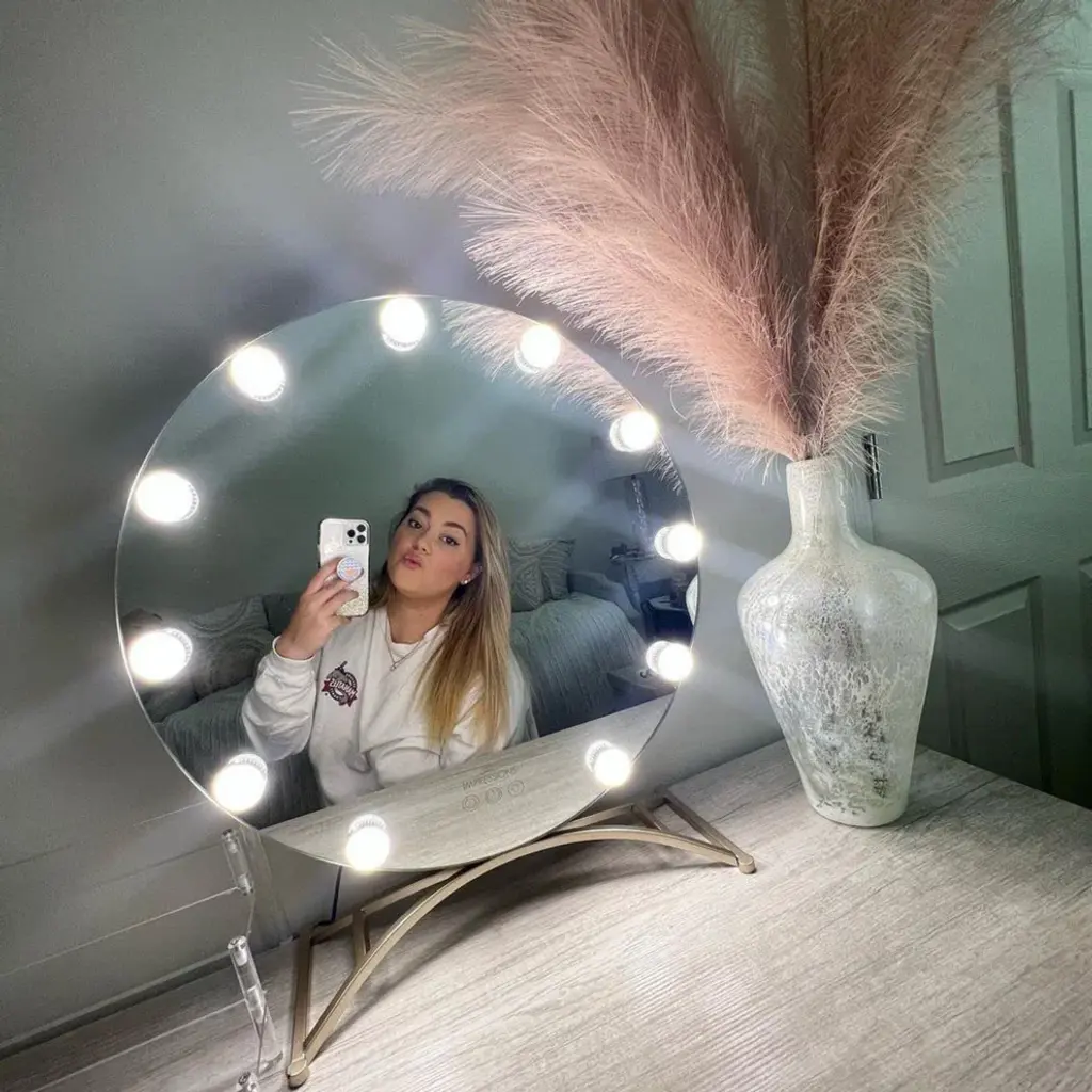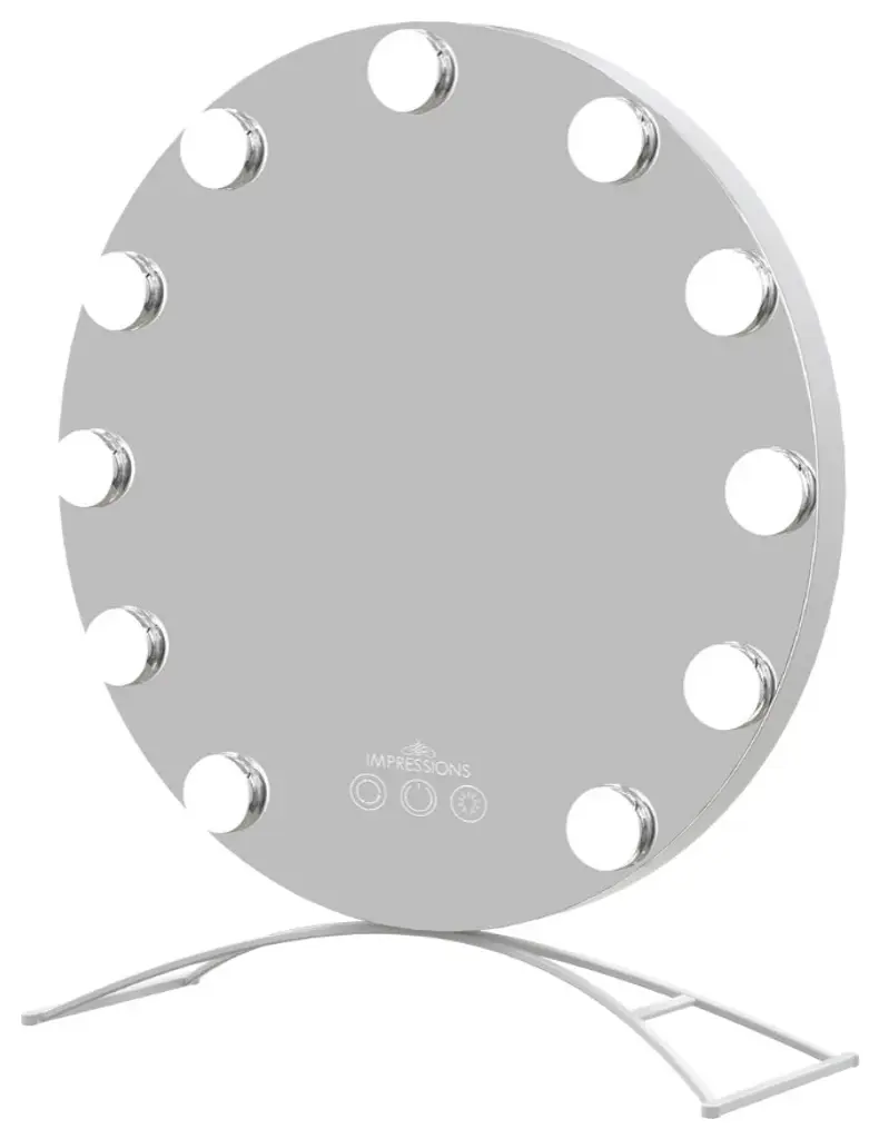 Impressions Vanity The Hollywood Round XL Tri Tone LED vanity mirror beautifully combines Hollywood elegance with the modern sophistication of long lasting, energy saving LED lighting, eliminating the need for traditional bulbs while keeping the glamorous studio look. It also comes with a beautiful base. To switch between natural, warm, or cool lighting tap the lighting button. This lighted mirror also has legs that you can attach and use on your makeup station or remove and use as a wall mounted mirror. Features:STUDIO MIRROR: This round shaped beauty vanity mirror combines the elegance of Hollywood with modern sophistication. It can create a makeup studio environment and add a beautiful flair to your glam roomLIGHTED MIRROR: This dressing mirror provides natural daylight LED effect to give you the perfect makeup look. These LED bulbs absorb the heat so you can do your makeup without any melting or not setting worriesSTAND BASE: This desk mirror has a frameless design edge with a mirror base which gives an amazingly enlightened look, also ensuring a strong position. It is perfectly designed for the tabletop vanity stationPOWER EXTENSION: This lighted mirror includes a regular power wall outlet behind the mirror. Simply plug it in and get the perfect light