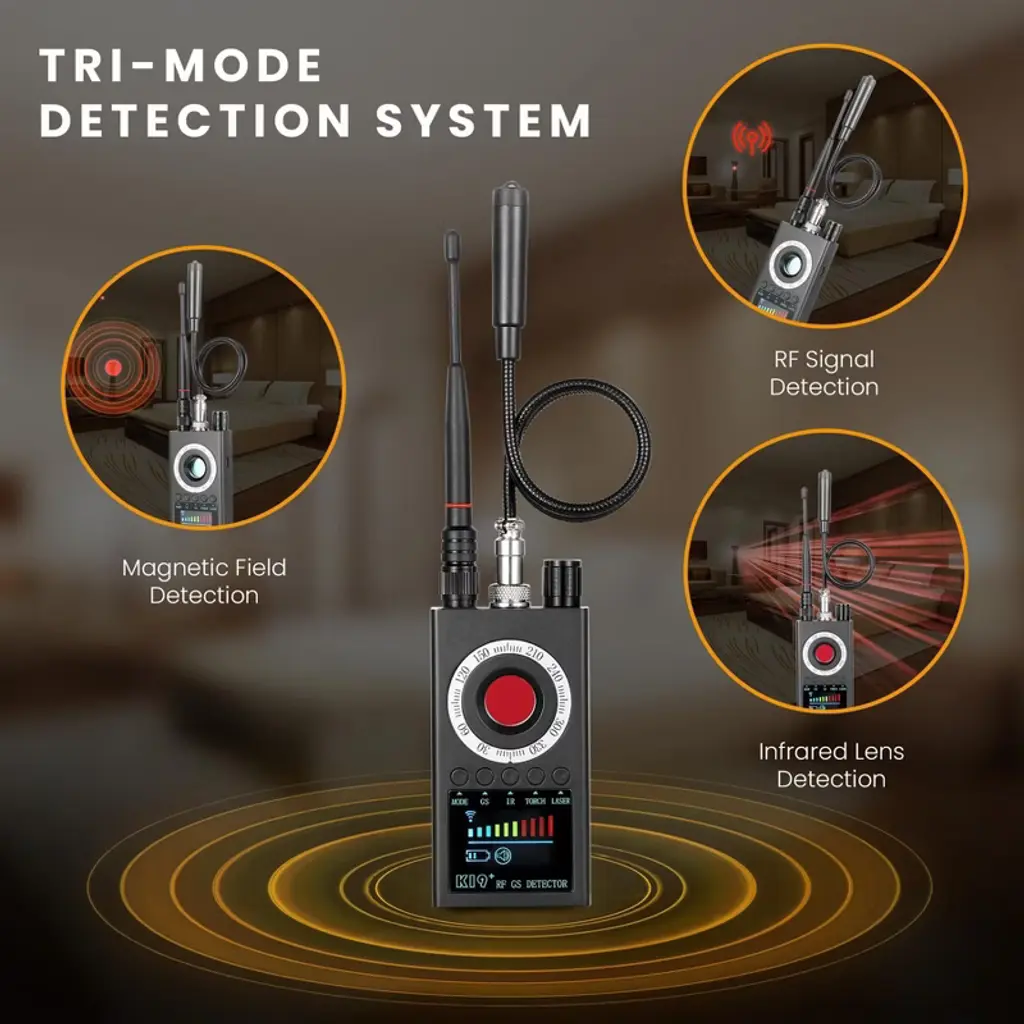 Protect your privacy anywhere with the HOM Deluxe Hidden Camera Detector. Safeguard your space with this all-in-one hidden camera detector. Featuring tri-mode detection—RF wireless, magnetic field, and infrared scanning—it quickly locates spy cameras, GPS trackers, and wireless bugs, even in everyday objects. The adjustable sensitivity dial helps pinpoint even the most discreet threats, while the built-in IR flashlight and view window makes spotting hidden lenses effortless. Compact, easy to use, and powered for up to 5 hours, it’s the ultimate travel-friendly tool for home, office, hotel, or vehicle protection.
