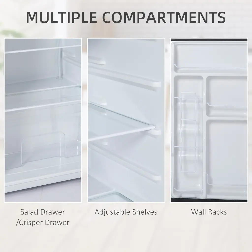 Descriptions:Do you get tired of running back and forth to the dorm fridge all the time? Wouldn't it be so easy to have the snacks and drinks you have every day within arm's reach? This HOMCOM small fridge for bedroom makes it, so you're not getting up and down all day, primarily if you work from home. There are tons of storage to fit all your favorites, and it is compact enough to sit next to your desk. Let this HOMCOM apartment size refrigerator make your day-to-day life more manageable.Features:● Designed with a mini freezer inside to chill food quickly. ● The temperature can be adjusted with the thermostat knob● The shelves are adjustable to suit foods of various sizes● The door has several compartments for bottles and cans of different sizes● Cools down quickly and quietly with a low-energy consumption compressor● The door is reversible to meet user's different habits● Two adjustable feet keep this cooler unit leveling on uneven floors● Compact size and low noise suits for an apartment, motor home, or dormSpecification:● Color: Silver● Material: Steel, Plastic● Overall Size: 18.75" W x 17.5" D x 33" H● Freezer Size: 15.5" W x 5" D x 7.25" H● Cooler Size: 15.75" W x 14" D x 29.25" H● Crisper Drawer Size: 15.5" W x 6.75" D x 5" H● Capacity: 0.35 Cu.Ft(freezer), 3.2 Cu,Ft(total)● Weight Capacity: 33 lbs. (shelf)● Noise Level: 39 dB● Defrost System: Manual● Door Opening Angle:180°● Voltage: 115 V, 60 Hz;● Power: 65W● Item Label: 800-129V81BK