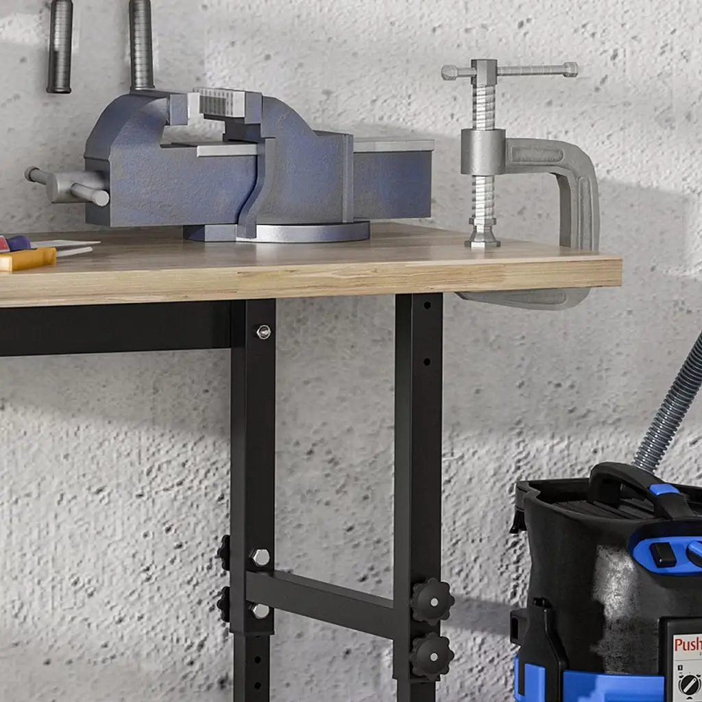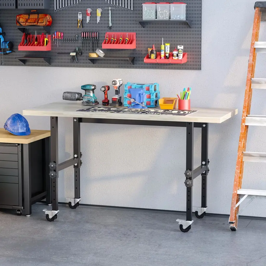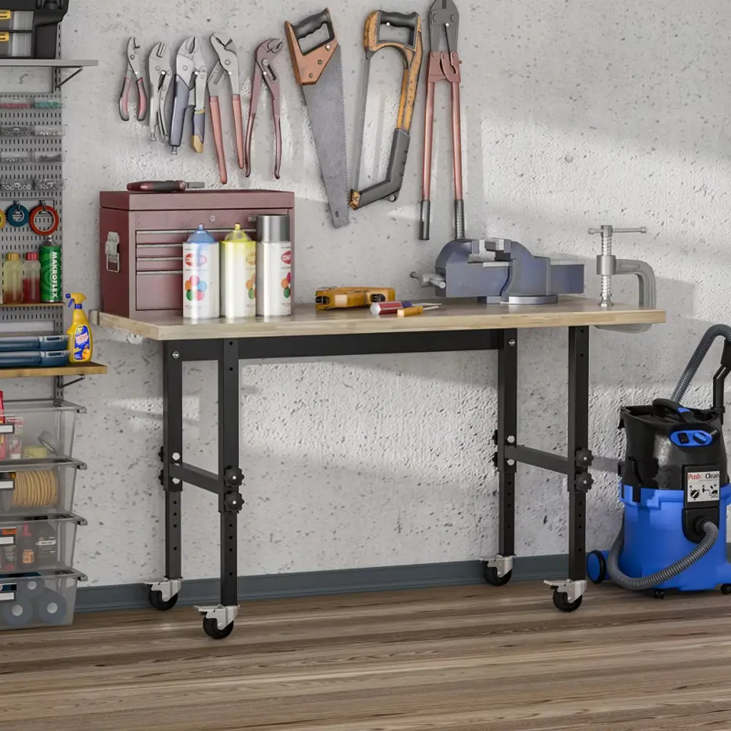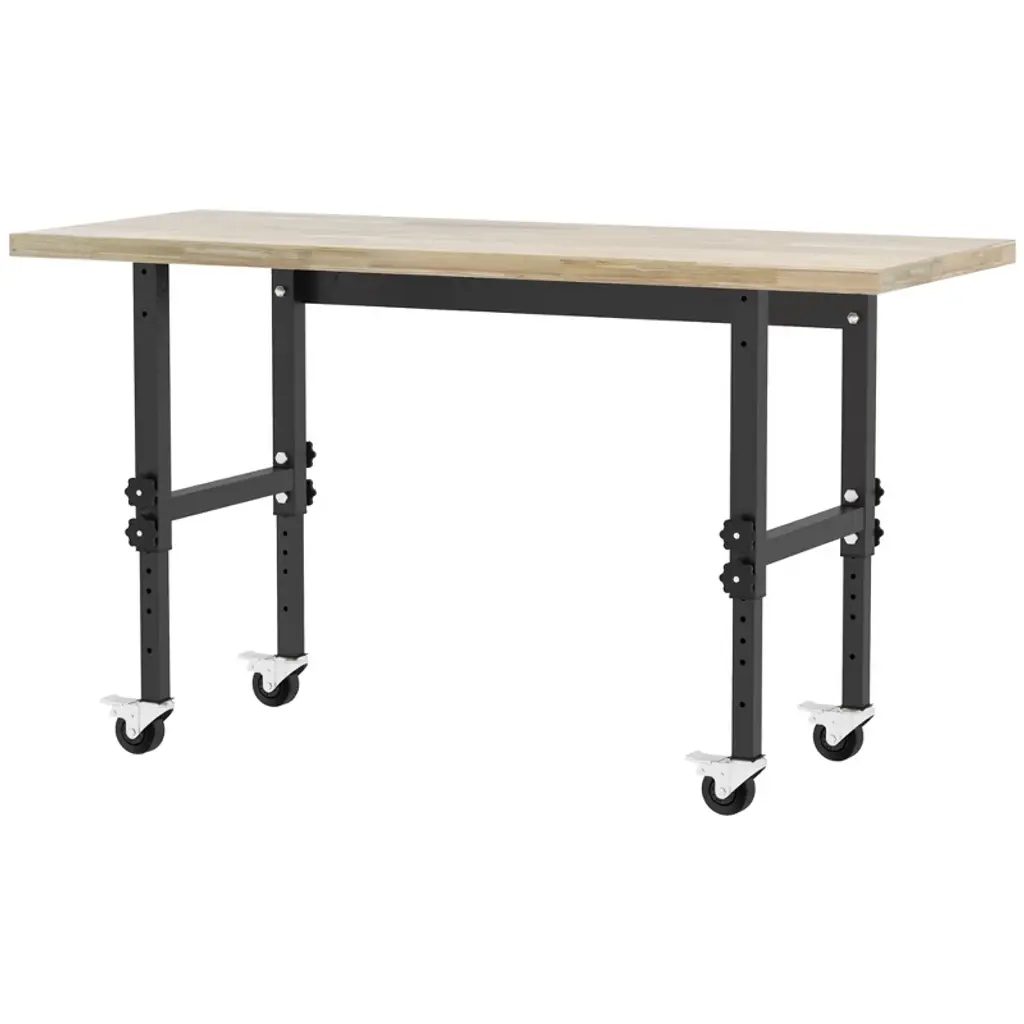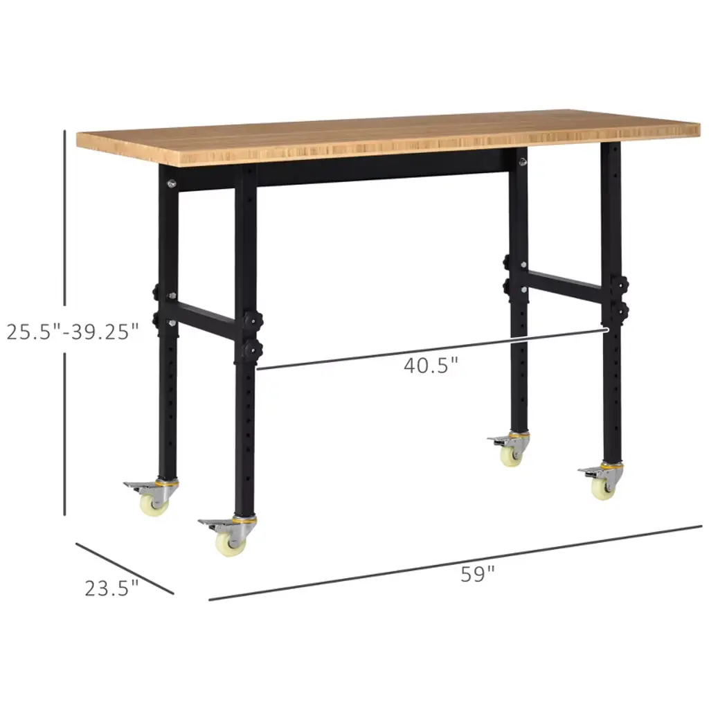 Reinvigorate your garage workspace with this HOMCOM rolling workbench. The work surface is made from heavy-duty bamboo wood and measures 1.5 inches thick for maximum sturdiness. Designed with solid steel legs, this standing table can handle all tasks from daily use to heavy-duty projects. Height can be adjusted according to your different working needs. Choose HOMCOM work bench to make your job much easier!