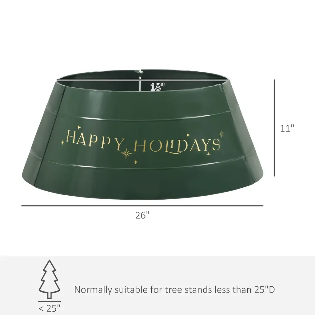 Descriptions:Decorate your Christmas tree with this Christmas tree stand cover from HOMCOM. It hides your tree stand, and keeps your kids, dogs, cats, and other animals away. Our beautiful holiday décor provides a great alternative to conventional tree skirts with easy setup and little mess or maintenance required. The metal tree collar is sure to be a great addition to your family's Christmas décor this year and in years to come.Features:● Type (pattern): a green finish and gold-tone "HAPPY HOLIDAYS". Decorate your room and hide your Christmas tree stand● Keep away your kids, dogs, cats, or other animals who consider your Christmas tree base as a toy● No need to rearrange the cloth like a traditional fabric tree skirt● Made of selected steel with electrophoretic coating and powder coating● Three pieces. Quick to set up and disassemble, saving storage spaceSpecification:- Color: Green- Material: Metal- Overall Dimension: Dia 26" x 11" H- Top Diameter: Dia. 18" - Normally suitable for 7.5ft high Christmas trees or tree stands less than 25"D- Item Label: 830-779V00GNNote: We suggest that you measure your tree stand to ensure its fit within the collar.