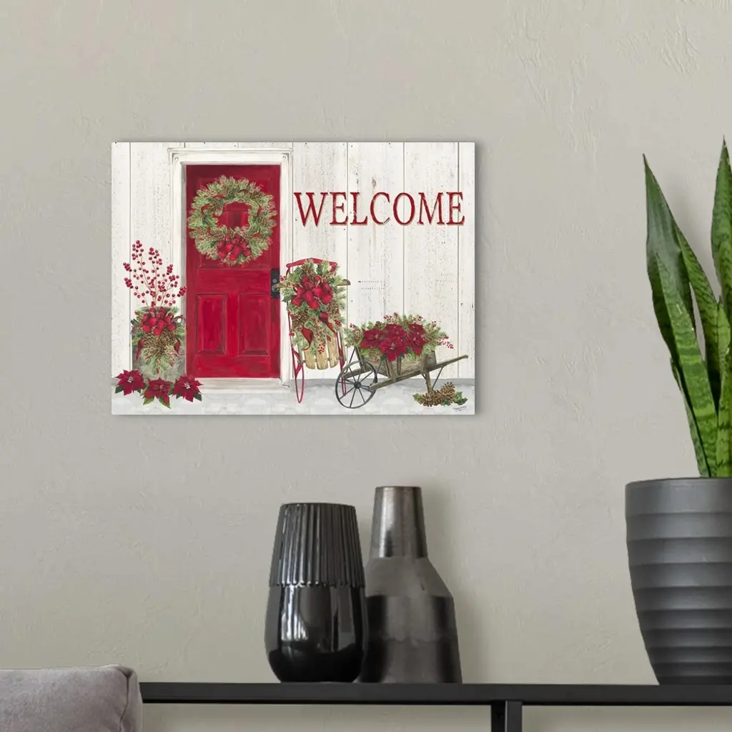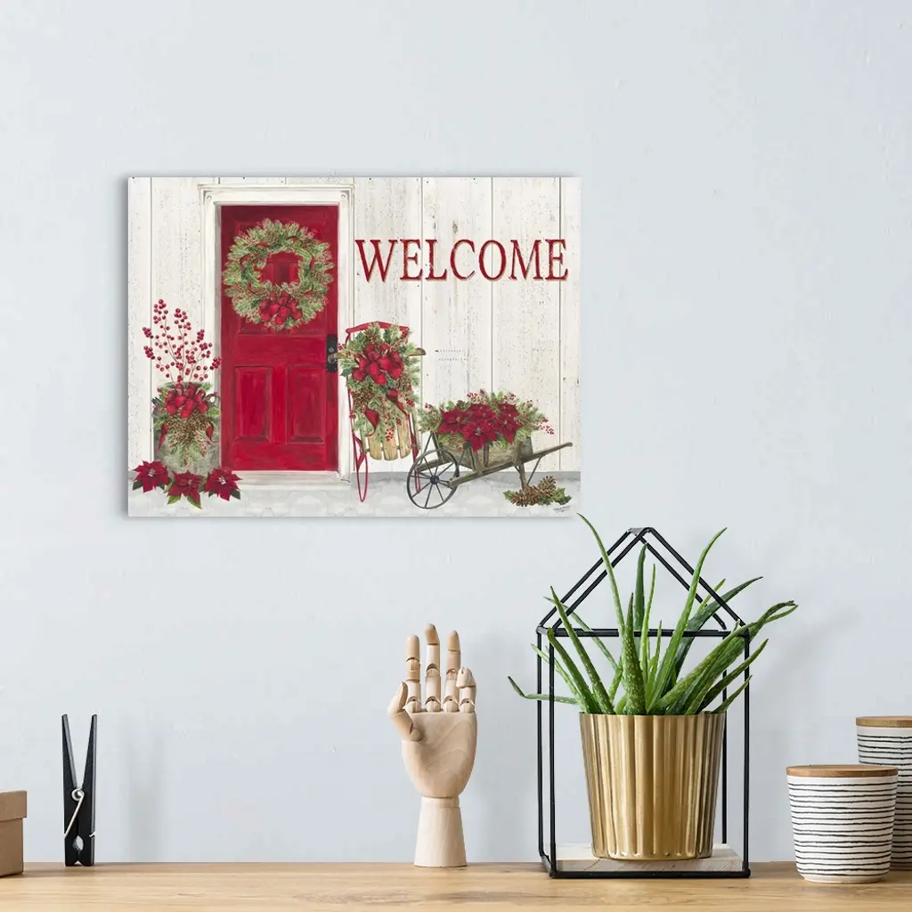 "Welcome" in red with a decorated door with a white wood panel wall.
