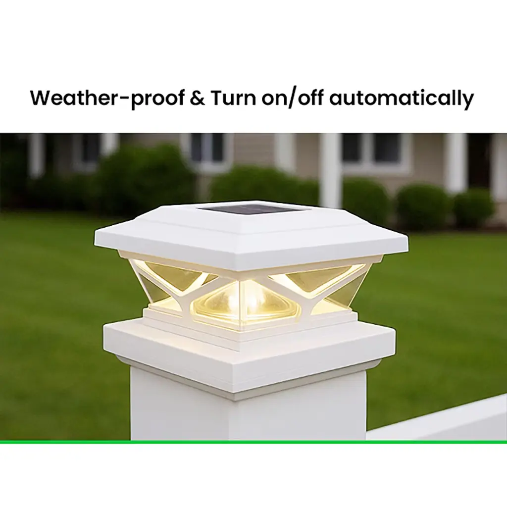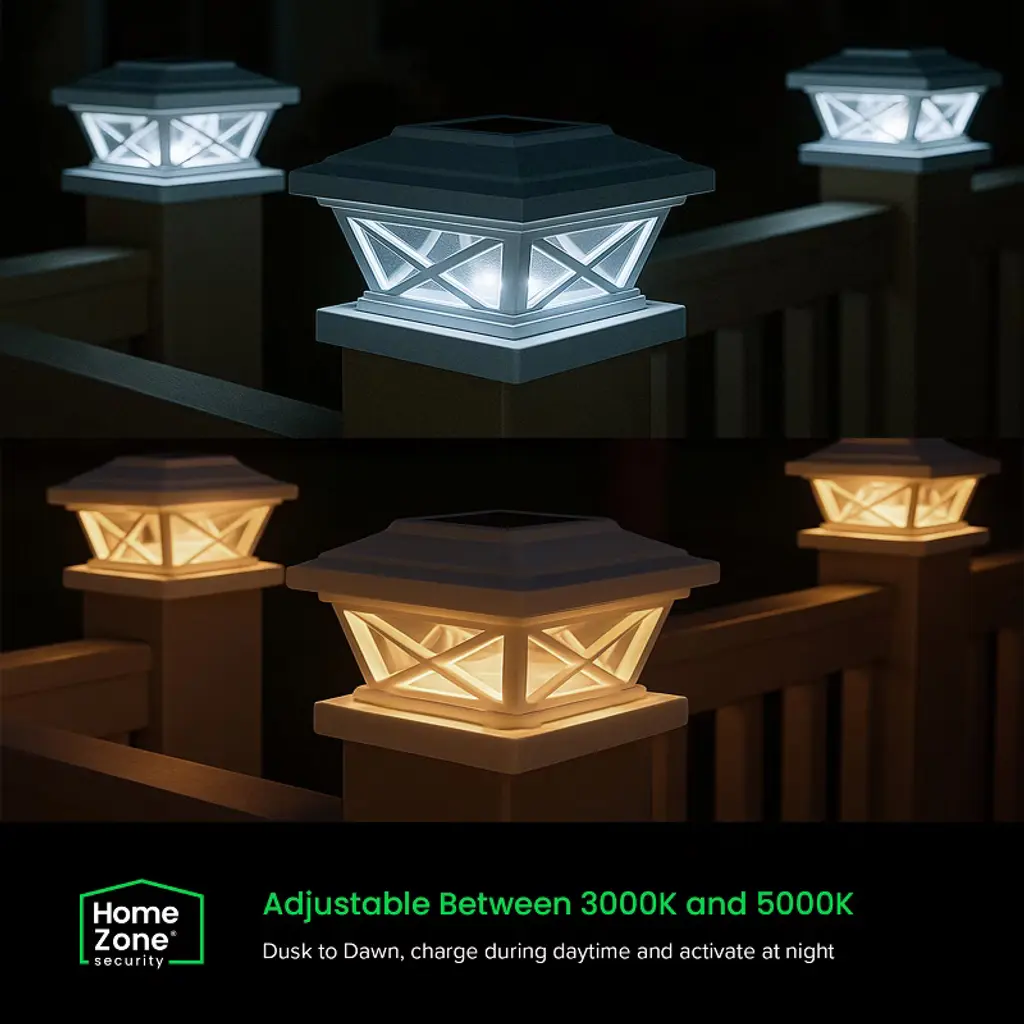Upgrade your outdoor spaces with the Home Zone Security® 4 Pack of Crown-Style Post Cap Lights - an ideal blend of elegant design and smart functionality. These solar-powered lights are crafted to enhance the beauty and safety of your fences, decks, or patios while withstanding the elements with their durable, weatherproof construction. Designed to fit both 3.5-in. x 3.5-in. and 4-in. x 4-in. posts, installation is quick and effortless, making them an ideal solution for any homeowner seeking a stylish lighting upgrade. Each light features a unique crown-style housing that adds a decorative touch by day and a warm, inviting glow by night. Powered by high-efficiency solar panels and equipped with long-lasting LiFePO4 rechargeable batteries, these lights automatically charge throughout the day and illuminate from dusk to dawn without the need for wiring or maintenance. Enjoy customizable ambiance with the adjustable LED color temperature setting, offering the choice between a cozy 3,000K warm white and a crisp 5,000K daylight tone to suit your mood and environment. Whether you're lighting up a garden path, framing your yard, or boosting nighttime visibility, the Home Zone Security® Post Cap Lights deliver reliable performance, energy savings, and a refined aesthetic to your outdoor décor.