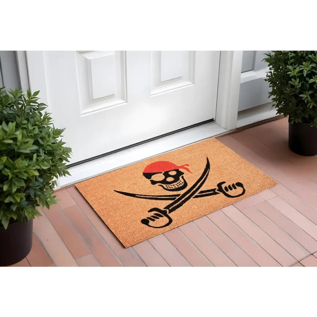 Known for it's extreme durability and ability to withstand heavy foot traffic, this 17-inch x 29-inch natural red and black coir pirate outdoor halloween door mat is an ideal option for the front door or entrance way of your home or business. Crafted from coconut husks, this mat is not only functional but is an an eco-friendly and visually appealing accessory. The naturally bristled texture of coir is an efficient way to clean dirt and mud from shoes and is easy to clean and maintain. Add this festive and decorative halloween mat to create a practical yet inviting welcome to all who enter. 17-inch H x 29-inch W x 0.6-inch D