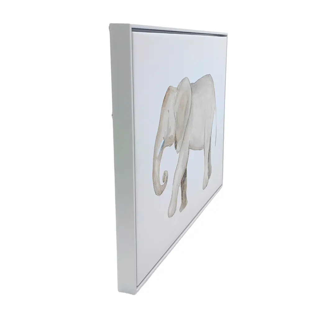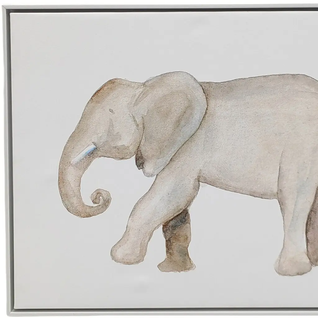 Add an air of fashion to your room and rejuvenate the space with this elephant white floater frame print wall art. Bring a little bit of the exotic jungle indoors with this good looking elephant wall art. This watercolor print is a visual artistic expression that allows you to decorate your space in style. Reproduced for you on canvas, this hanging decorative accent will be a trendy and fashionable way to dress your walls. Utilize this opportunity to create a focal point in the room with this fabulous wall decor option. 18-inch h x 24-inch w x 1.37-inch d.Dress up your walls with color and dimension that is ideal for bedroom, den, playroom, office, or nursery.Features a white floater frame construction for a finished appearance.Hanging wall art helps you to personalize your space with design.Jungle animal wall art that includes an elephant.This special art is printed on canvas, and comes ready to hang with hardware on the back for easy mounting.Wall art is a quick and easy way to change up the look and feel of your room.