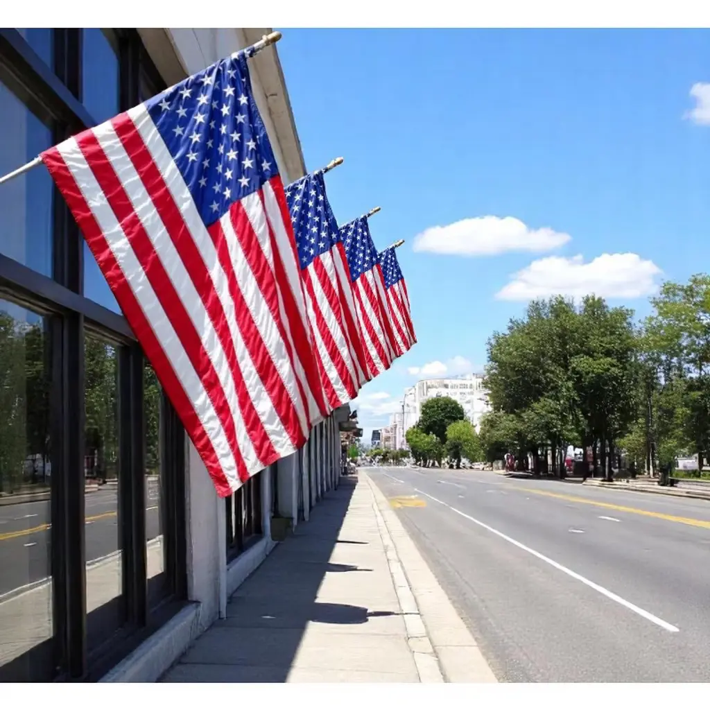 Set of four red white and blue embroidered nylon American flags brings patriotic flair to your outdoor space. Made from durable heavy duty nylon, these 3' x 5' flags are designed to withstand the elements while maintaining their vibrant colors. This flag set will not only enhance your outdoor decor but also serve as a symbol of USA pride and unity. Elevate your space with this timeless set that embodies the spirit of freedom and American heritage. 36-inch h x 50-inch w x 0.1-inch d.