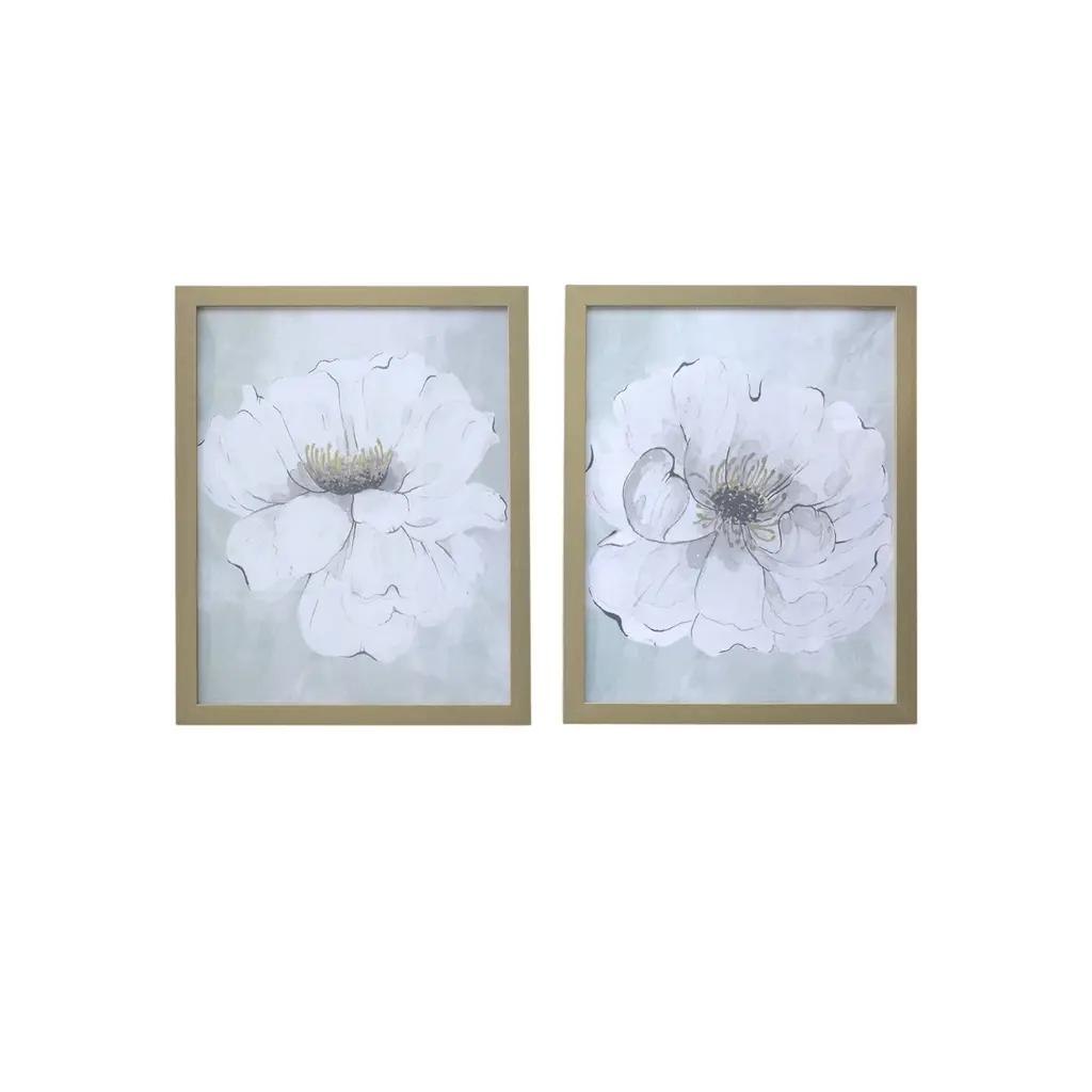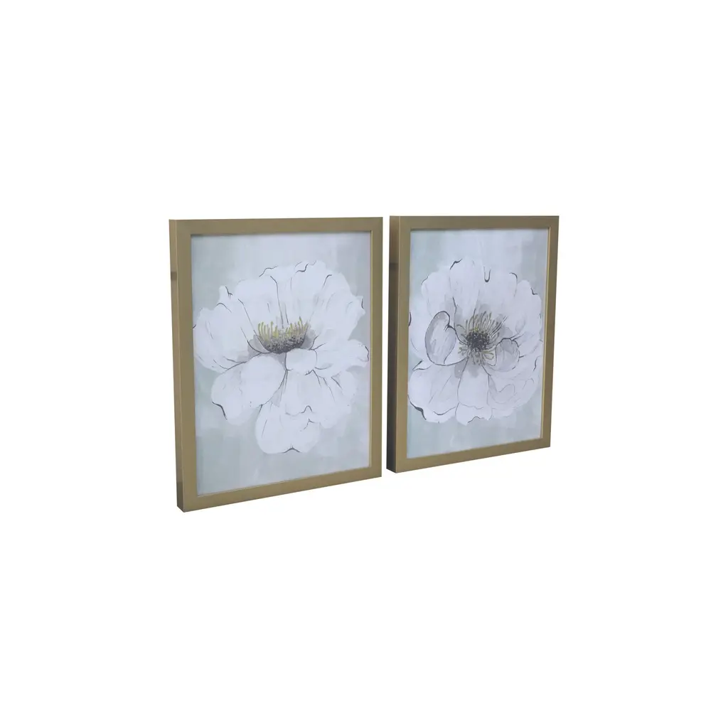 This watercolor painting is a way to express your artistic style and add some fashion to your walls. Reproduced for you on canvas, this hanging decorative accent will be a trendy and fashionable way to dress your walls. Hang on your wall to add some up to date fashion and decoration. Utilize this opportunity to create a focal point in the room with this fabulous wall decor option. 20 inches H x 32 inches W x 1.5 inches DBuilt to last with a frame made of durable glass and MDF in a gold finish .Built to last, sturdy construction from paper.Comes ready to hang with attached hanging hardware on the back. Hangs in a vertical orientation.Lightweight and easy to hang on most wallsSet of 2 Oversized White Roses Wall Art. Big and beautiful this floral pair features just the right touch of gold metallic.