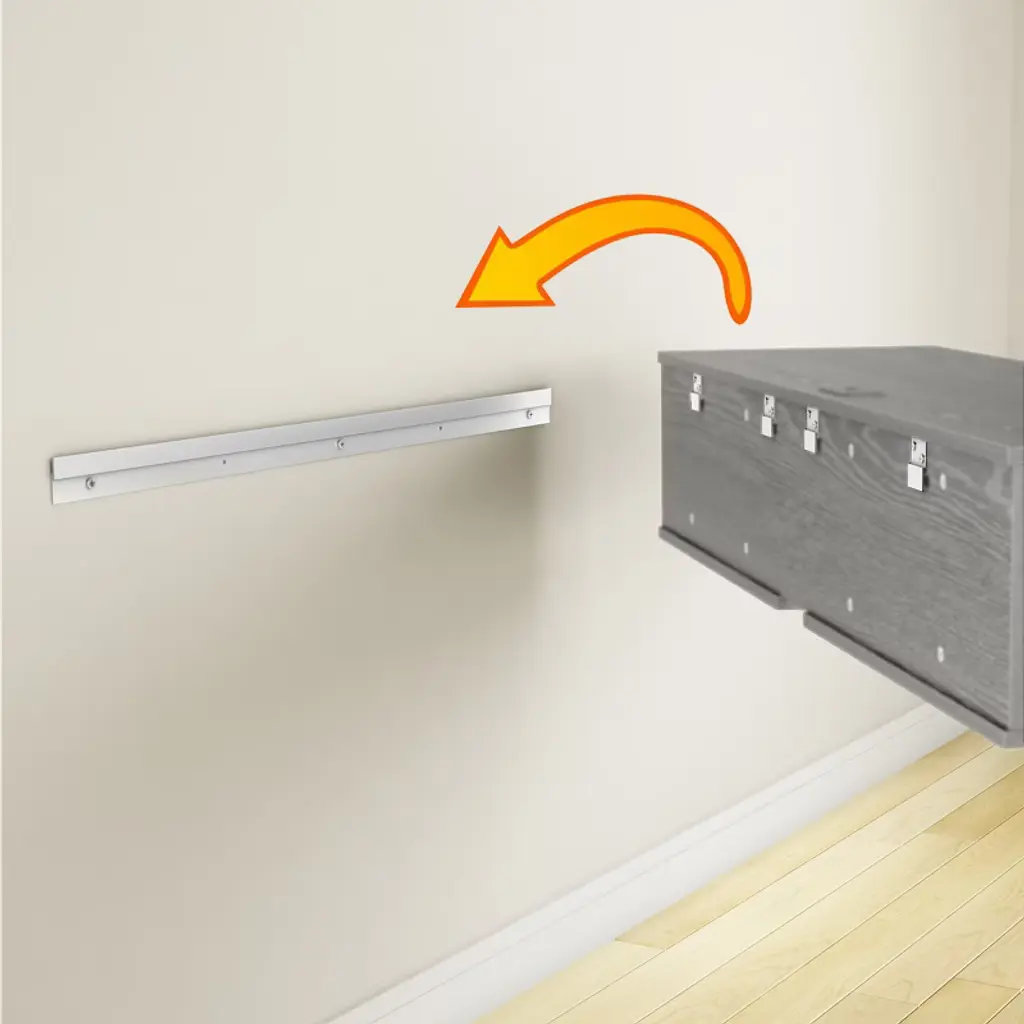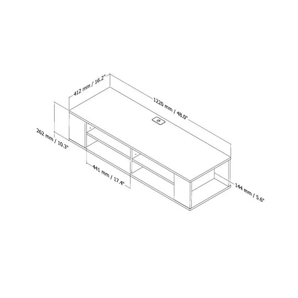 This modern, designer look wall mount media console will free up space and give your living room a light, airy look. Its multiple open storage spaces, and others for passing cords through, were specially designed to meet today's electronic equipment needs. This piece will be perfect under the TV on your wall, for a truly contemporary look!