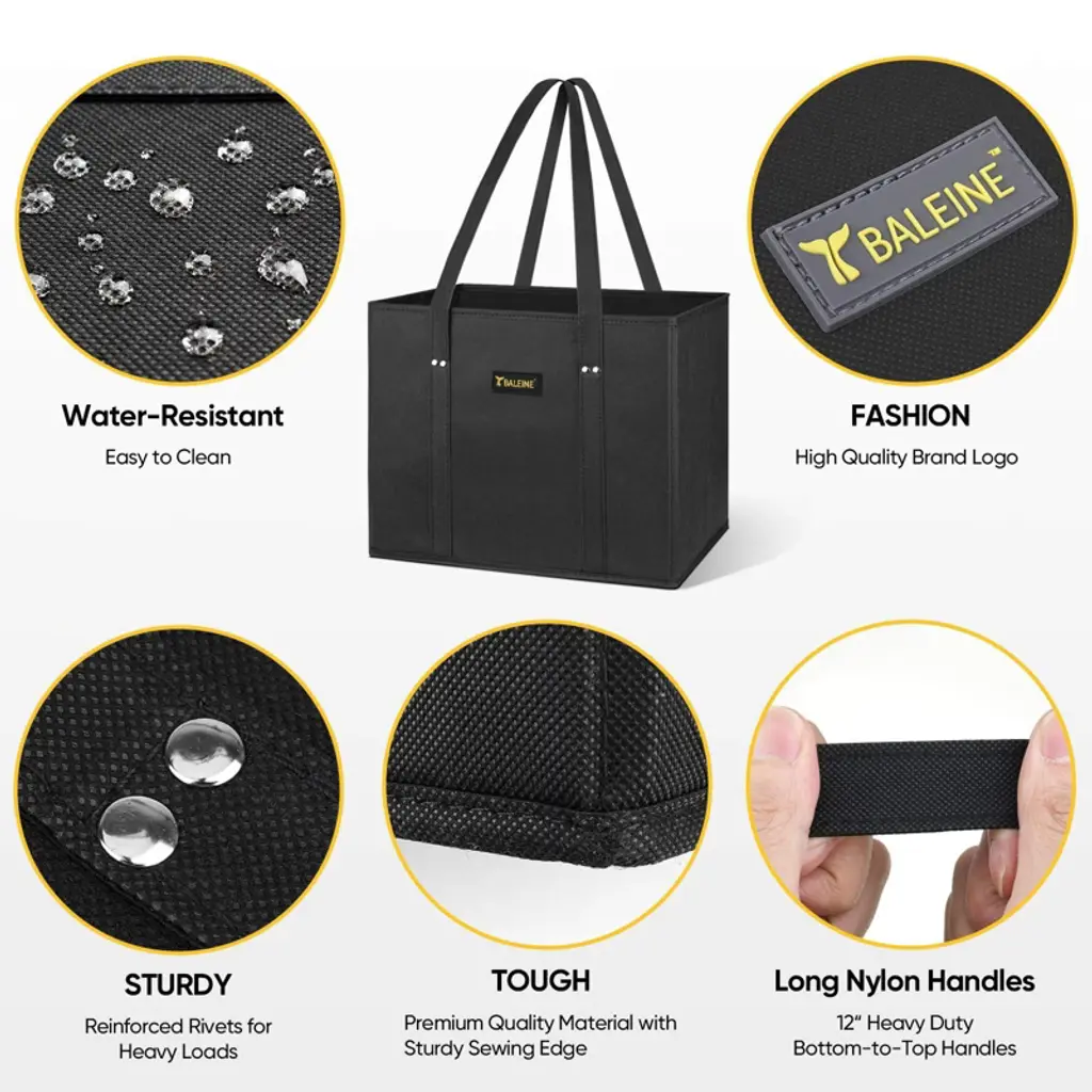 Homlux 3Pk Reusable Grocery Food Storage Bags Foldable, Reinforced Bottom, Long Handles, Black
