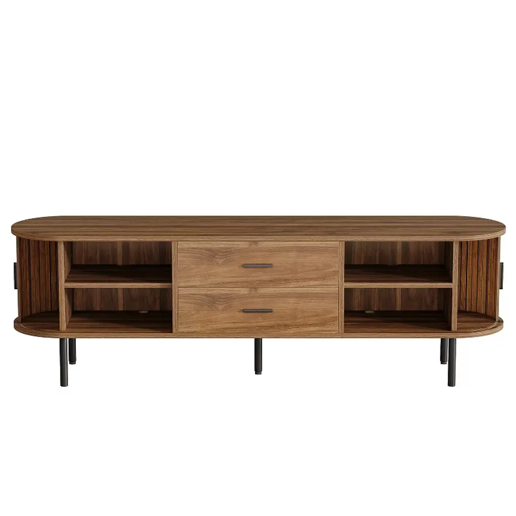 Elevate your living room with our mid-century modern TV stand, featuring an oval shape and innovative slatted tambour sliding door for a touch of vintage elegance. Designed to accommodate TVs up to 75 inches, this stand offers adjustable shelving with three height levels to customize your storage space. Keep your setup clean and organized with built-in cable management systems, and enjoy the durability and easy maintenance of high-quality MDF construction.