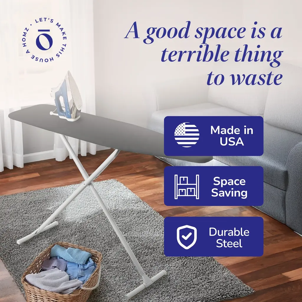 Keep calm and press on! Bid farewell to wrinkled clothing and say hello to the Homz T-Leg Ironing Board, your key to stress-free ironing. This ironing board is an essential tool to make ironing that much easier, featuring an adjustable height, a folding design, and ample board space. With a 53-by-13-inch perforated steel top, this ironing table offers even heat distribution and provides a sturdy, spacious surface for textiles of all types; suits, dresses, table linens, you name it! The smooth 100-percent cotton cover and foam pad withstand up to 450-degree heat and provide a seamless glide as you iron. The T-leg steel frame design ensures a stable foundation while the non-skid feet protect your flooring, giving you peace of mind wherever you set up. This space-saving ironing board easily adjusts to any height, up to 35 inches tall, so you can work comfortably for precise ironing. For compact storage, press the quick-release lever toward the ironing board and retract the legs to the closed position. The patented leg lock system enables the board to be folded securely for storage and transportation. Don't let creases cramp your style. Maintain your wrinkle-free reputation with the Homz T-Leg Ironing Board. T-Leg steel frame ironing board provides a stable ironing foundation with non-skid feet to protect your floors Solid perforated steel ironing surface evenly distributes heat and steam onto garments, eliminating wrinkles effortlessly Smooth 100-percent cotton cover and polyurethane foam pad allows your iron to glide across your garments; Cover withstands up to 450-degree heat Ample 53-inch long by 13-inch wide board surface provides enough space for garments of all types Conveniently adjusts to any height, up to 35 inches tall for comfort as you iron Patented leg lock system ensures the ironing board is folded securely for storage and transportation Cover cleaning: Dampen a clean, soft cotton cloth, wipe down, and hang dry; Do not machine wash or dry the cover Material: Steel Color: Charcoal gray Folded dimensions (L x W x H): 55.75 x 14 x 2.5 inches Overall dimensions (L x W x H): 53 x 13 x 35 inches Weight: 9.5 pounds