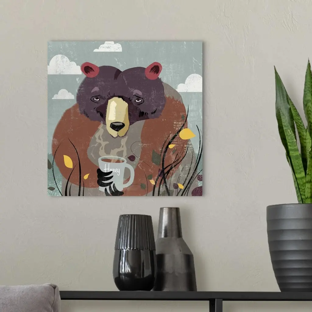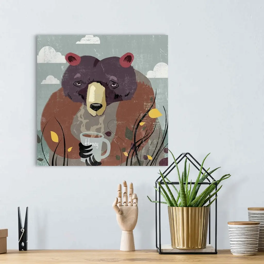 Contemporary home decor art of a bear sitting among flowers and grass holding a mug with steam pouring out of it.