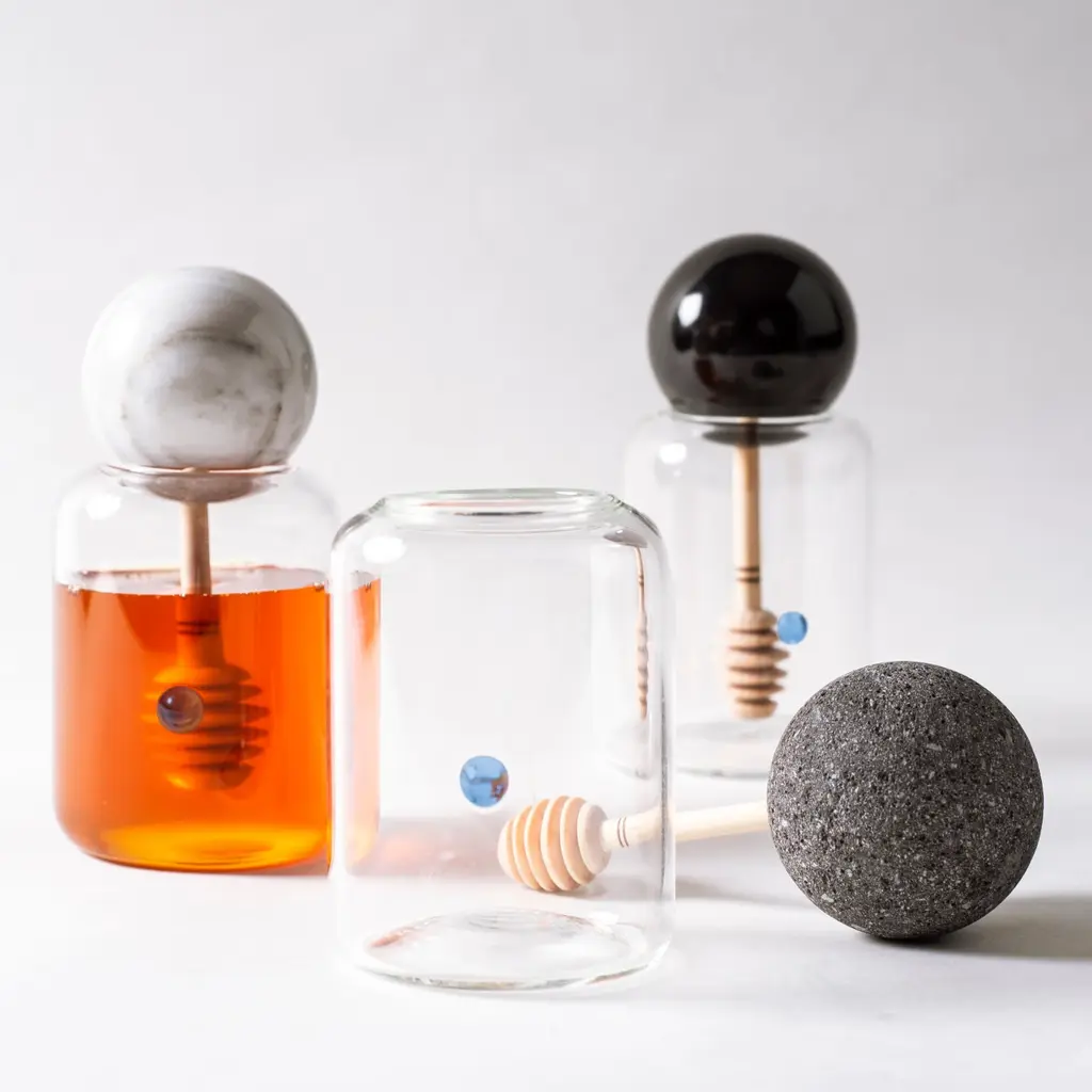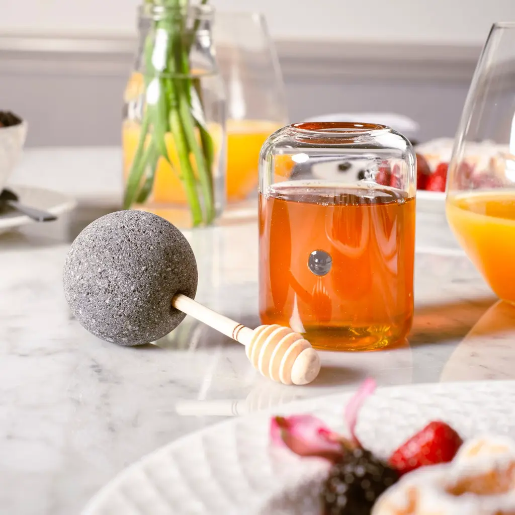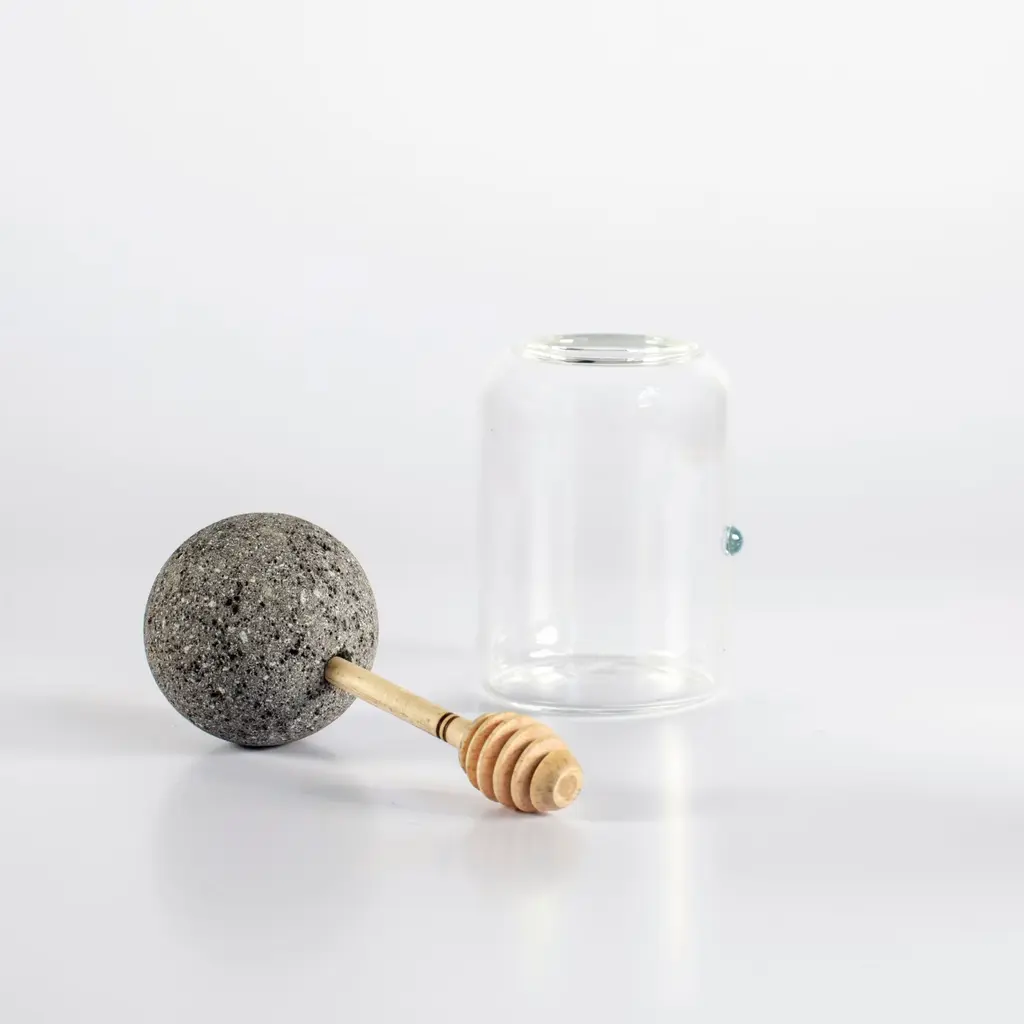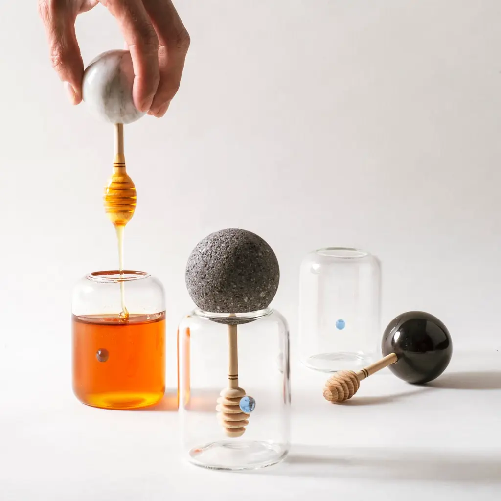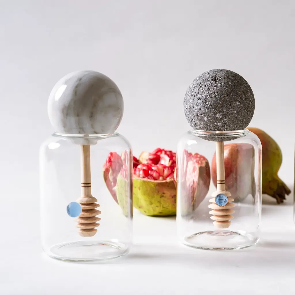 Handmade borosilicate glass honey container. Glass more complex and difficult to manufacture thanks to its thermal resistance, thin thickness but just as resistant as the traditional one. The sphere is carved in marble or volcanic stone. Available in variety of colors. And it works both as a lid and a handle of the honey spoon. Spoon carved in pine wood.This cutie will sweeten your breakfast or tea every day. Its blue detail characterizes it even when it is empty.Designed and manufactured by And Jacob for the "miscellaneous" collection of the Mexican Design Gallery, part of the 2019 Mexican Design Open.
