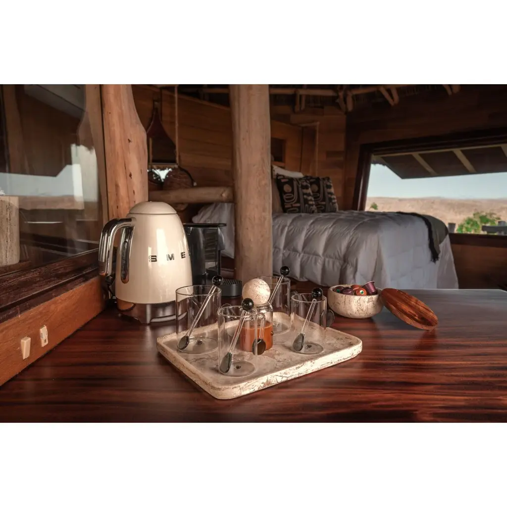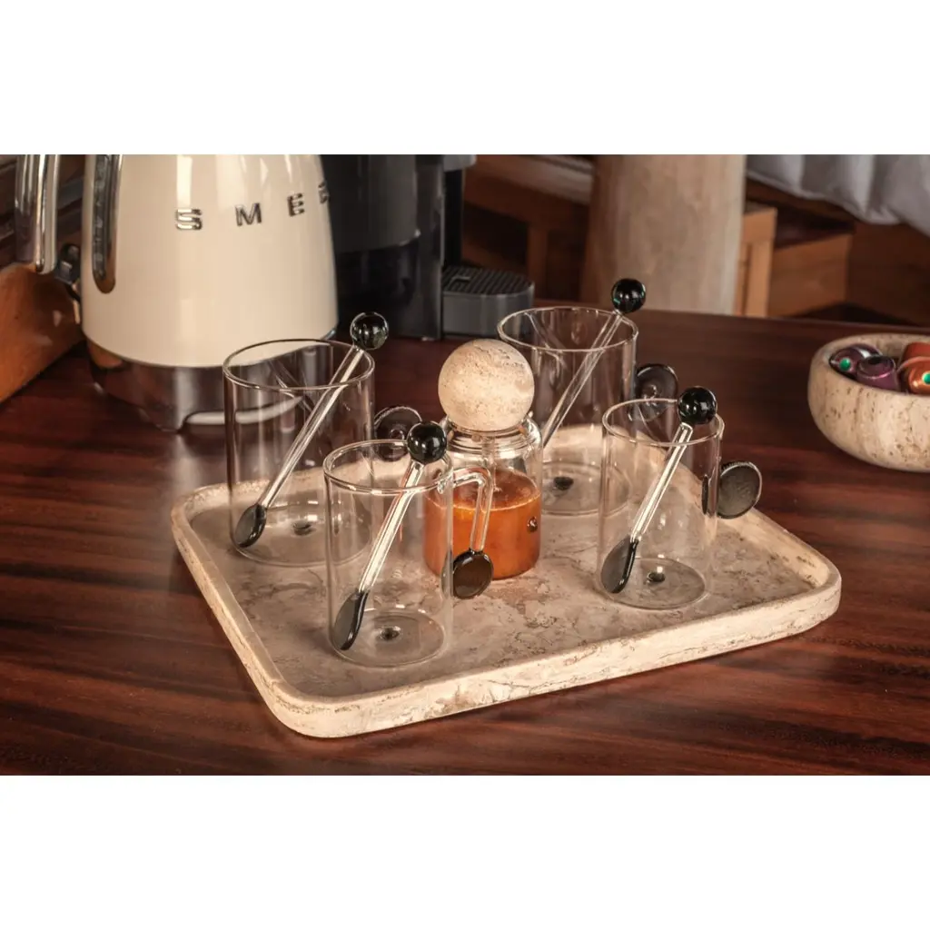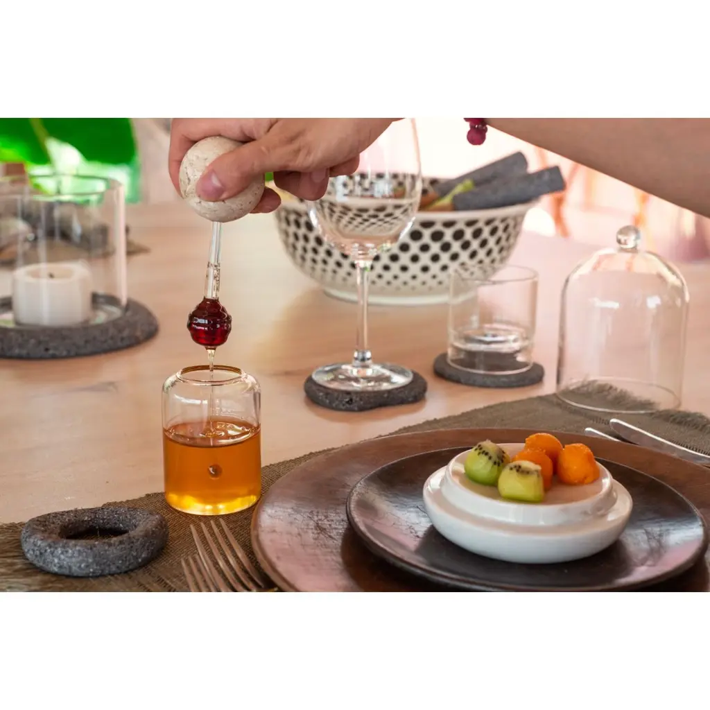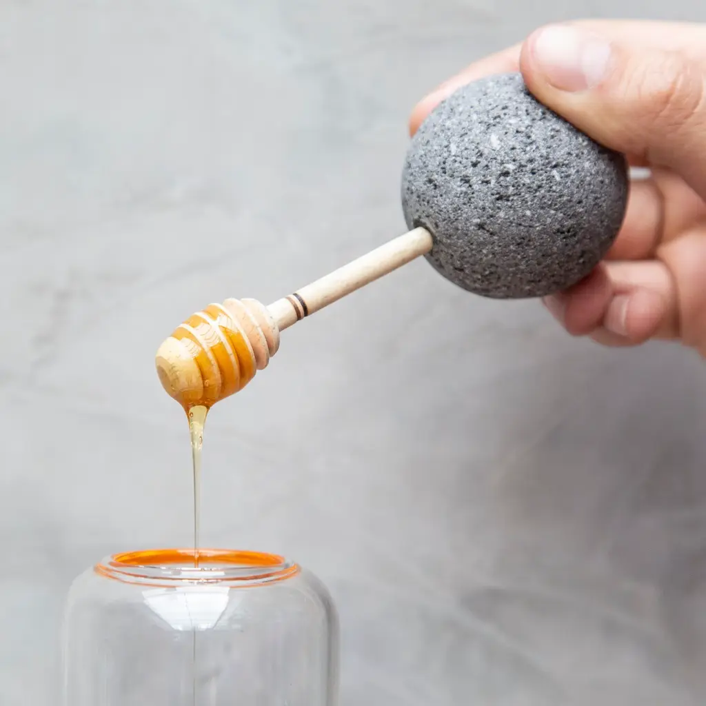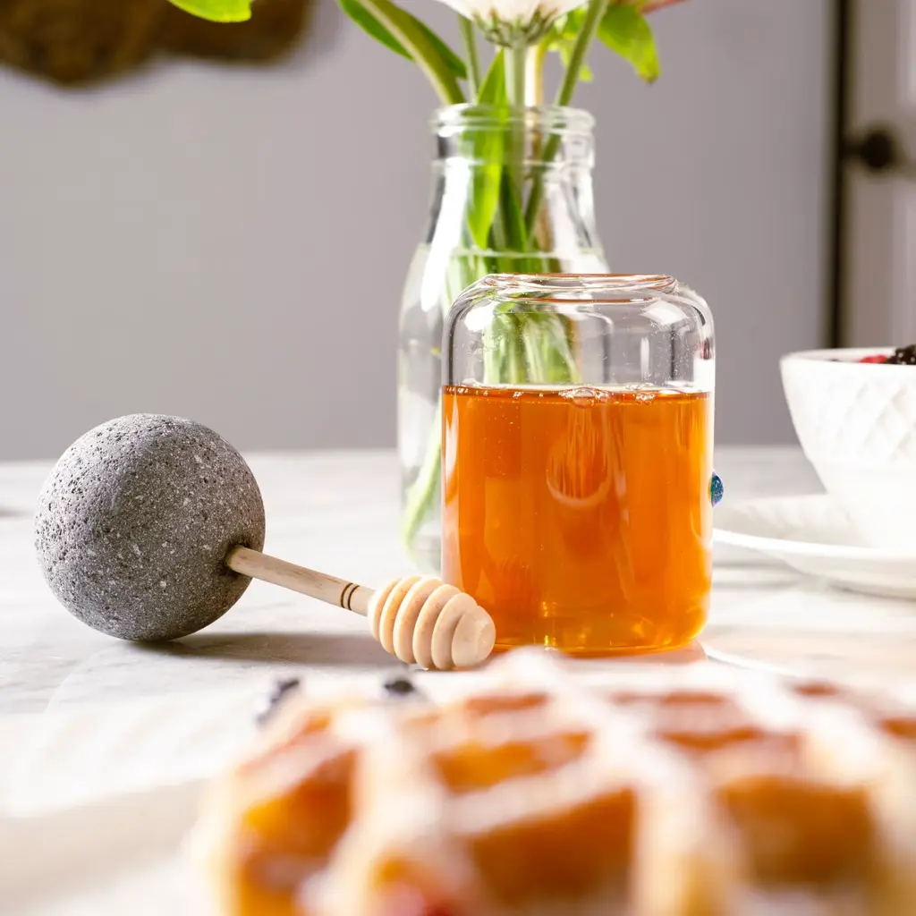 Handmade borosilicate glass honey container. Glass more complex and difficult to manufacture thanks to its thermal resistance, thin thickness but just as resistant as the traditional one. The sphere is carved in marble or volcanic stone. Available in variety of colors. And it works both as a lid and a handle of the honey spoon. Spoon carved in pine wood.This cutie will sweeten your breakfast or tea every day. Its blue detail characterizes it even when it is empty.Designed and manufactured by And Jacob for the "miscellaneous" collection of the Mexican Design Gallery, part of the 2019 Mexican Design Open.