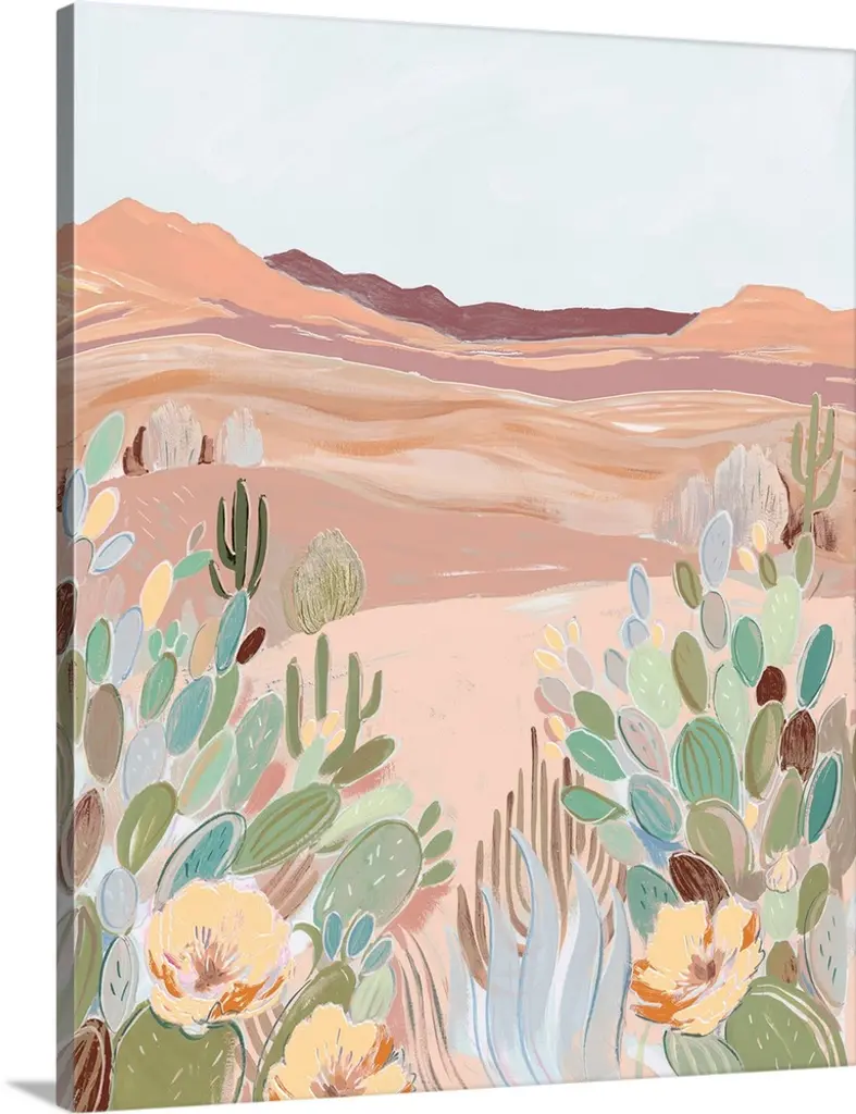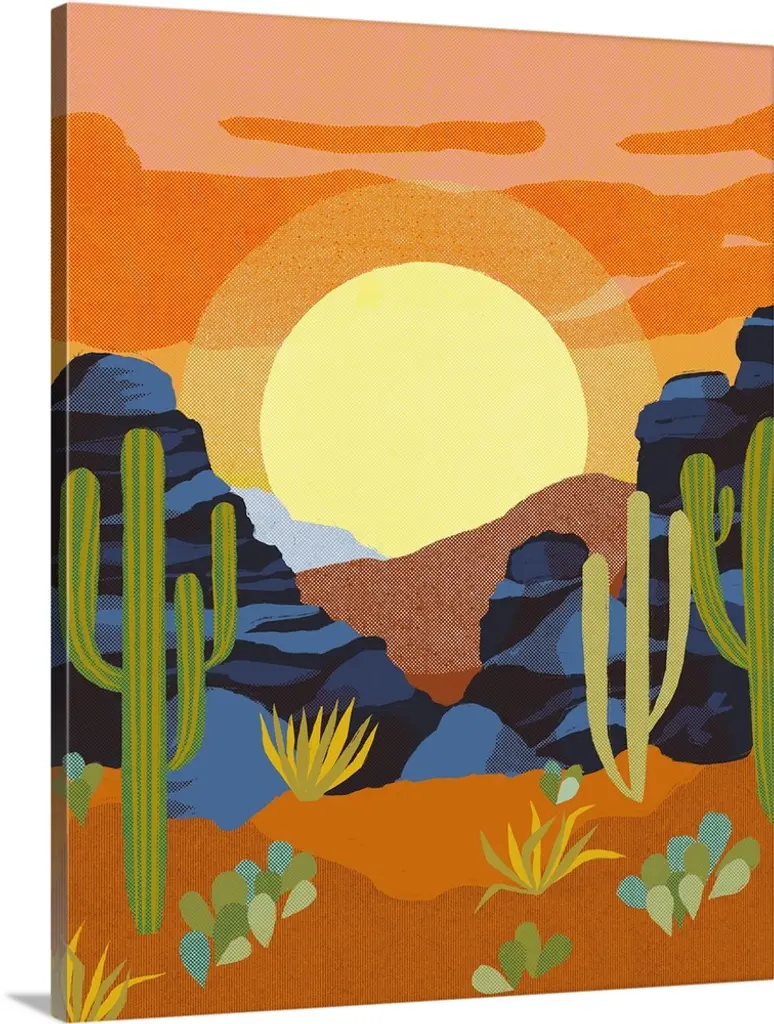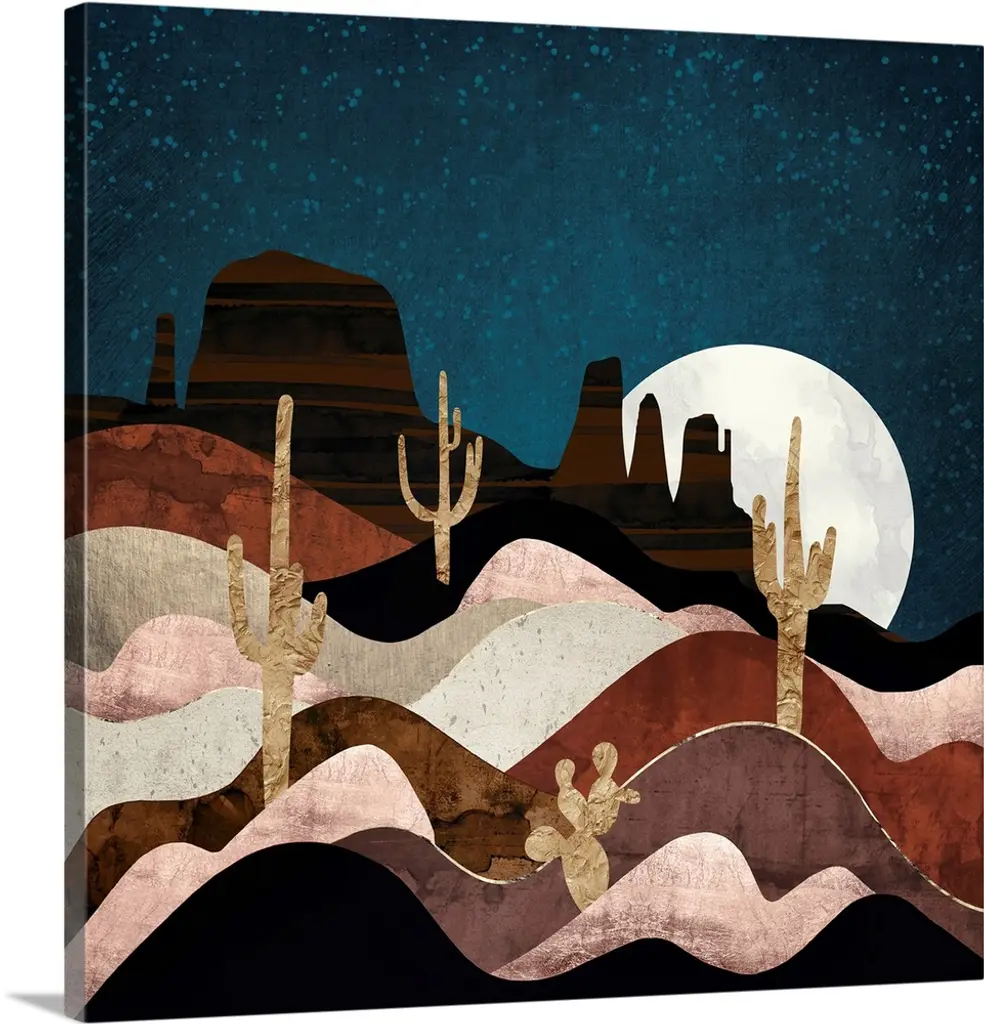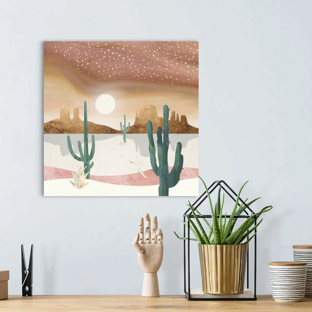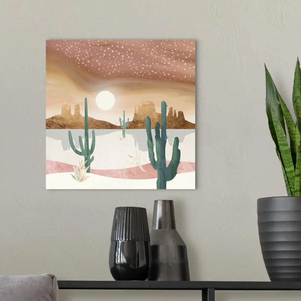Abstract desert scene featuring a honey sky, mountains, stars, gold, cactus, pink and green.